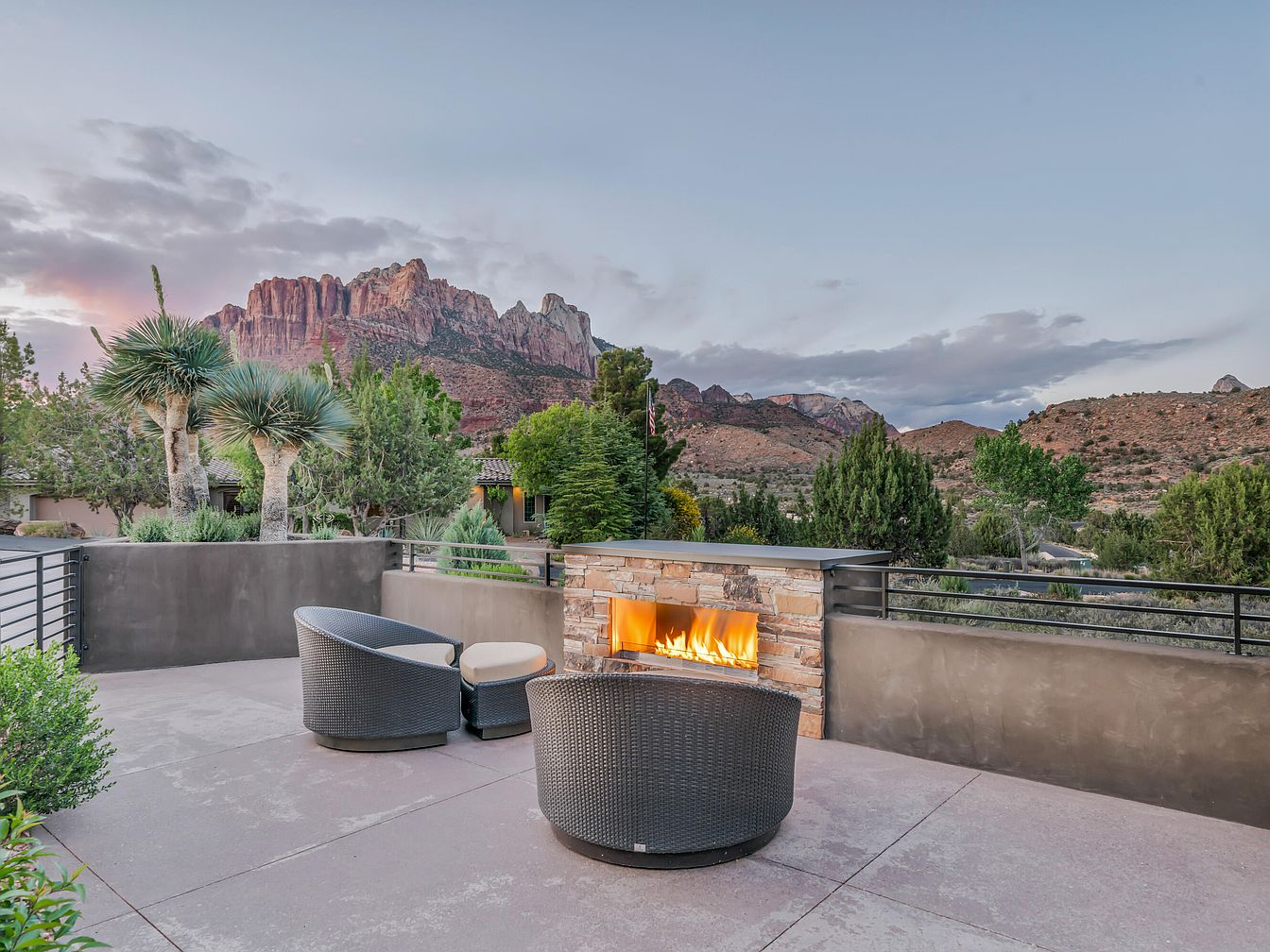 This spacious outdoor patio offers a serene retreat with sweeping views of rugged red rock mountains under a twilight sky. The area boasts a contemporary design with clean lines and neutral tones. Two rounded wicker chairs with light cushions create an inviting seating arrangement around a sleek built-in stone fireplace, emanating warmth and ambiance. The patio surface is smooth and muted in color, blending seamlessly with the natural surroundings. Potted plants and desert-adapted trees provide subtle greenery, while a minimalist railing ensures unobstructed views, making this patio perfect for relaxing or entertaining outdoors.