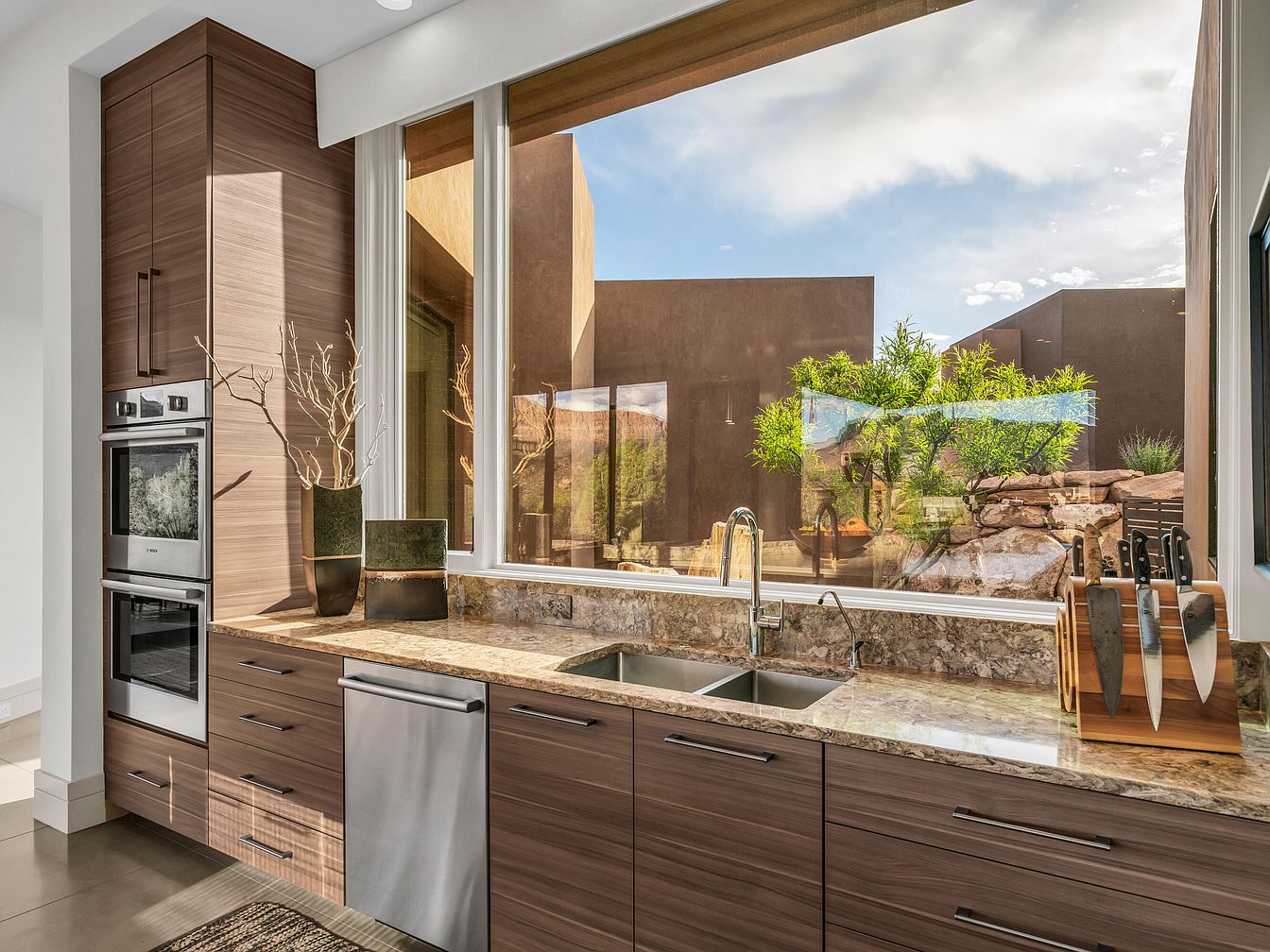 This kitchen features a sleek and modern design with horizontal wood-grain cabinetry in warm tones, complemented by a polished stone countertop with natural textures and colors. A large, seamless window above the double stainless steel sink lets in ample natural light, offering a scenic view of an outdoor courtyard with desert-inspired landscaping and architectural elements in earthy browns. Stainless steel appliances, including a built-in double oven and dishwasher, enhance the contemporary feel. The space balances functionality and aesthetic appeal with minimalistic cabinet handles, a clean layout, and decorative vases that add subtle organic shapes to the structured environment.