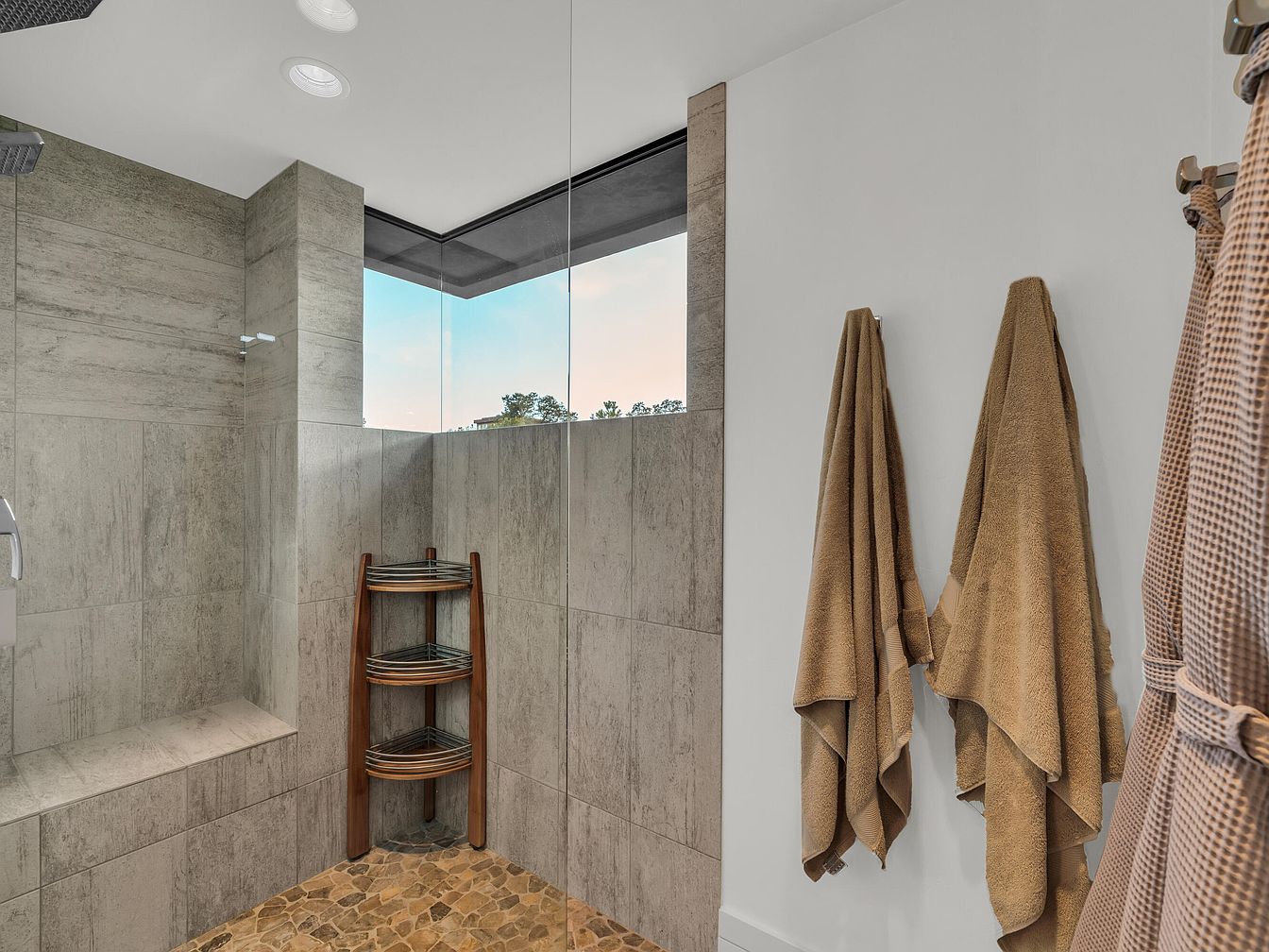 This bathroom features a modern walk-in shower with large, smooth stone tiles in muted earth tones that extend from the floor to the built-in bench and walls. The shower floor is composed of pebble-style stones, adding natural texture and warmth to the space. Two sleek glass panels, including a corner window, bring in natural light and offer a serene view of the outdoors without compromising privacy. On the adjacent white wall, two soft beige towels hang neatly alongside matching bathrobes, emphasizing the room’s soothing, neutral color palette and minimalist, spa-like ambiance.