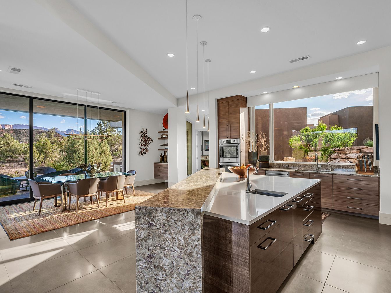 This spacious kitchen features a contemporary open layout seamlessly connecting to a dining area with floor-to-ceiling glass windows that offer stunning views of the surrounding natural landscape. The kitchen island boasts a sleek white countertop paired with a textured stone waterfall edge, complemented by dark wood cabinetry with modern, rectangular metal handles. Above the island, minimalist pendant lights create a sophisticated ambiance. The dining area highlights a glass-top table with cushioned chairs on a warm-toned rug. Natural light floods the space, enhancing the neutral beige floor tiles and creating a bright, inviting environment.