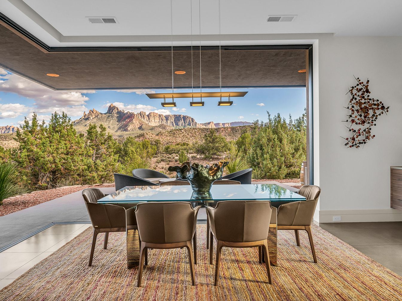 This dining room features a sleek glass table surrounded by six modern, cushioned chairs in a warm beige tone, resting on a textured woven rug that adds subtle color and warmth to the space. The room opens entirely to the outdoors with a fully retractable glass wall, seamlessly blending the interior with the expansive natural landscape beyond. Above the table, contemporary pendant lighting with a geometric design provides balanced illumination. Neutral walls are accented by an abstract, metallic wall sculpture, enhancing the minimalist and nature-inspired aesthetic, while framing breathtaking mountain and desert views.