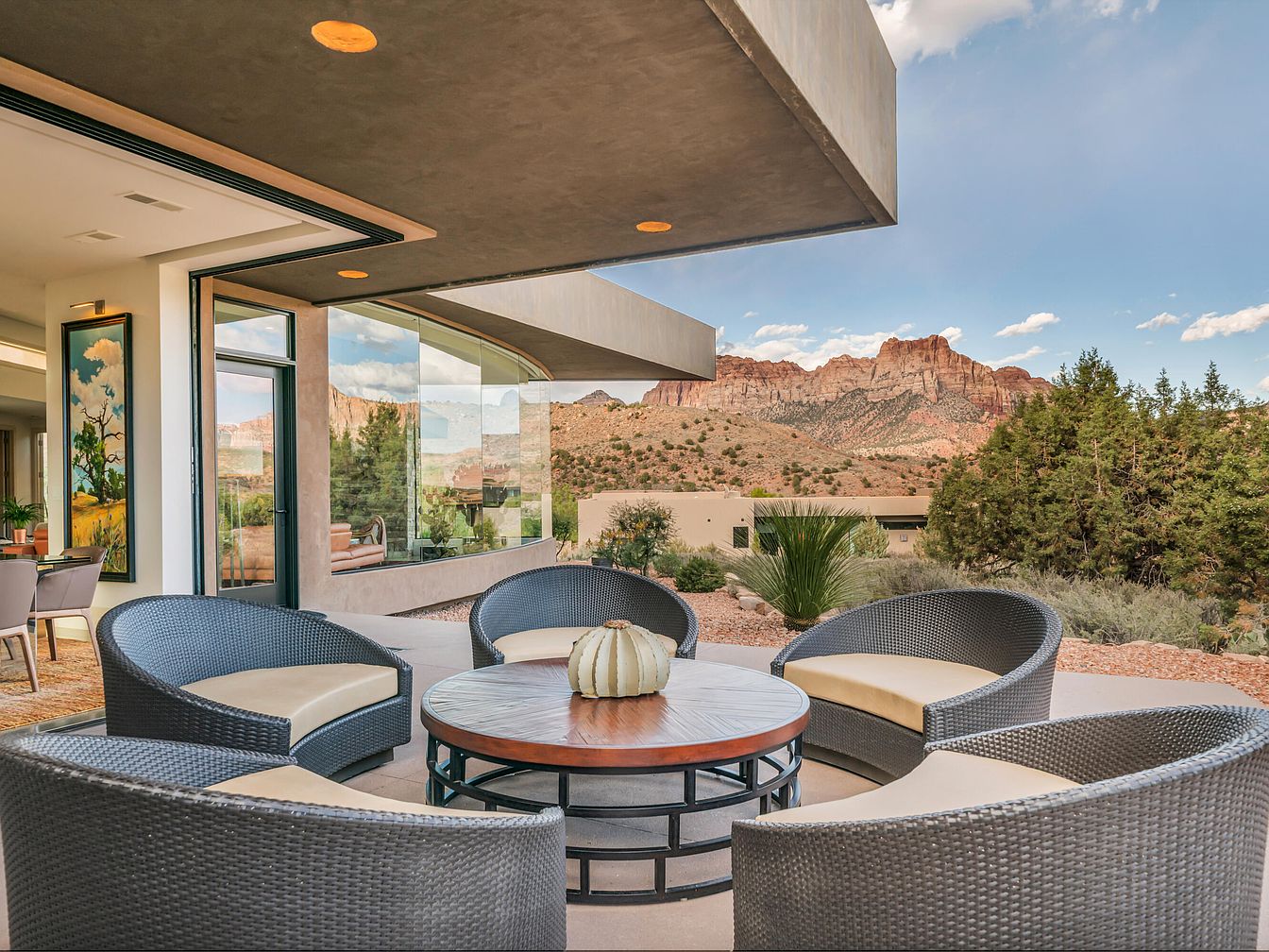 This inviting outdoor patio features a contemporary seating area with four rounded wicker armchairs arranged around a circular wooden table, topped with a simple decorative centerpiece. The chairs have beige cushions that provide comfortable contrast against the dark woven material. The space is sheltered by an overhanging flat roof accented with recessed lighting, creating a cozy ambiance. Floor-to-ceiling glass panels and doors seamlessly connect the indoor living spaces with the natural surroundings. The view beyond showcases a rugged desert landscape with rocky hills and sparse greenery, highlighting the home’s harmonious balance of modern comfort and nature.