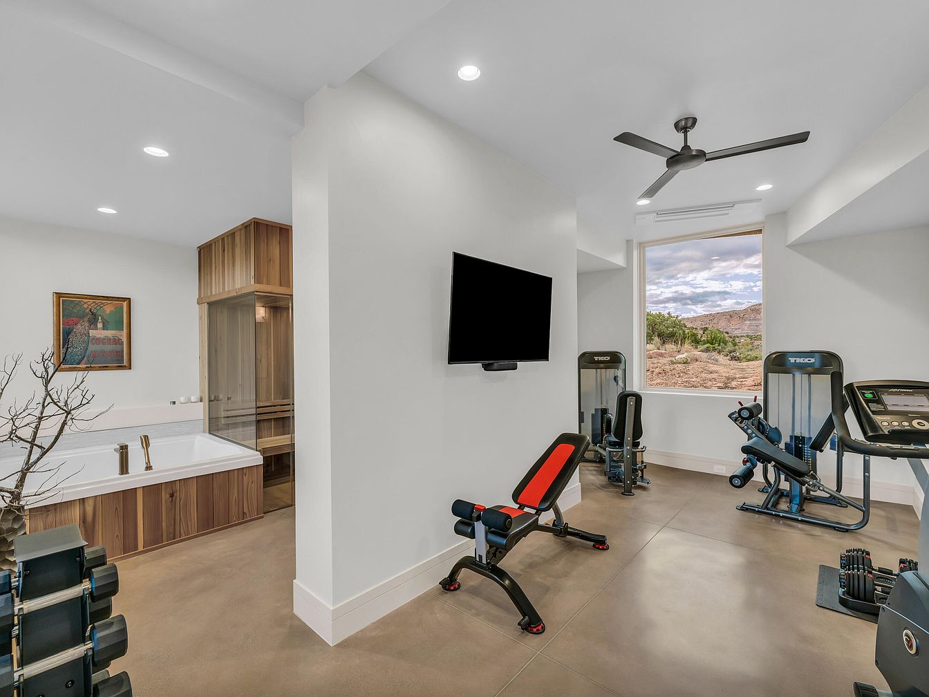 This wellness space combines a sleek home gym with a relaxing spa area, demarcated by a partial wall. The gym side features a variety of modern exercise equipment, including a treadmill, weight machines, and an adjustable bench with black and red upholstery, all set against smooth beige flooring. A large window offers natural light and scenic views of the outdoors, enhancing the airy ambiance. The spa side showcases a bathtub and a cedar-lined sauna with glass doors, offering warmth and tranquility. White walls, recessed lighting, and a black ceiling fan unify the clean, contemporary aesthetic.