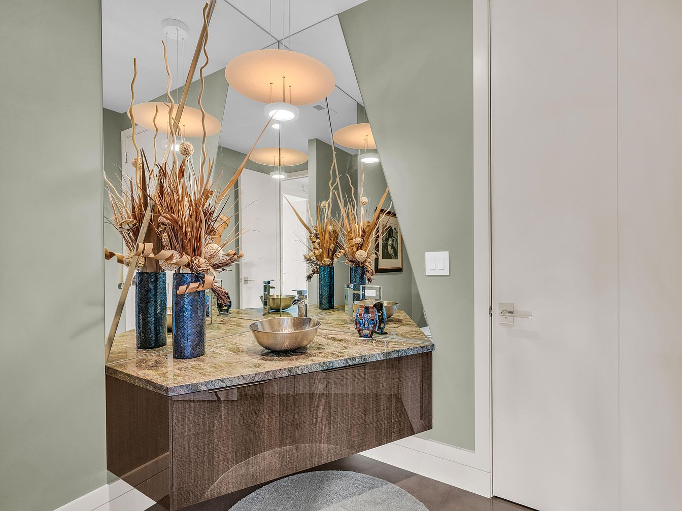 This elegant vanity area features a floating cabinet with a sleek wood texture and a polished marble countertop that adds luxury. A unique, asymmetrical mirror design extends from the countertop upward, reflecting soft ambient light from the modern, circular ceiling fixtures. The muted sage green walls complement the beige and earthy tones of the countertop, while the round silver basin enhances the contemporary aesthetic. Tall blue vases filled with dried natural branches and decorative elements add warm organic texture and color contrast. A subtle gray round rug grounds the space, creating a cozy yet refined ambiance.
