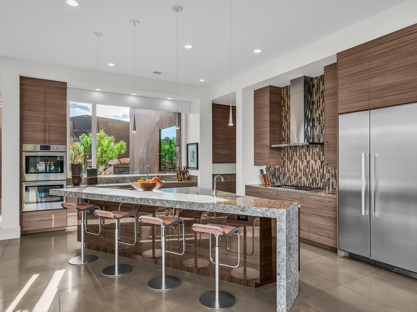 This kitchen features a sleek, contemporary design with a spacious marble island serving as the centerpiece, providing ample seating with four modern bar stools. The cabinetry is finished in a warm wood tone with a horizontal grain that complements the neutral, polished tile flooring. Stainless steel appliances, including a double oven and large refrigerator, add a professional touch. The backsplash behind the stove showcases a stylish mosaic tile pattern with vertical strips in earth tones, enhancing the modern aesthetic. Pendant lights and recessed lighting brighten the space, while a large window brings in natural light and offers a view of lush greenery outside.