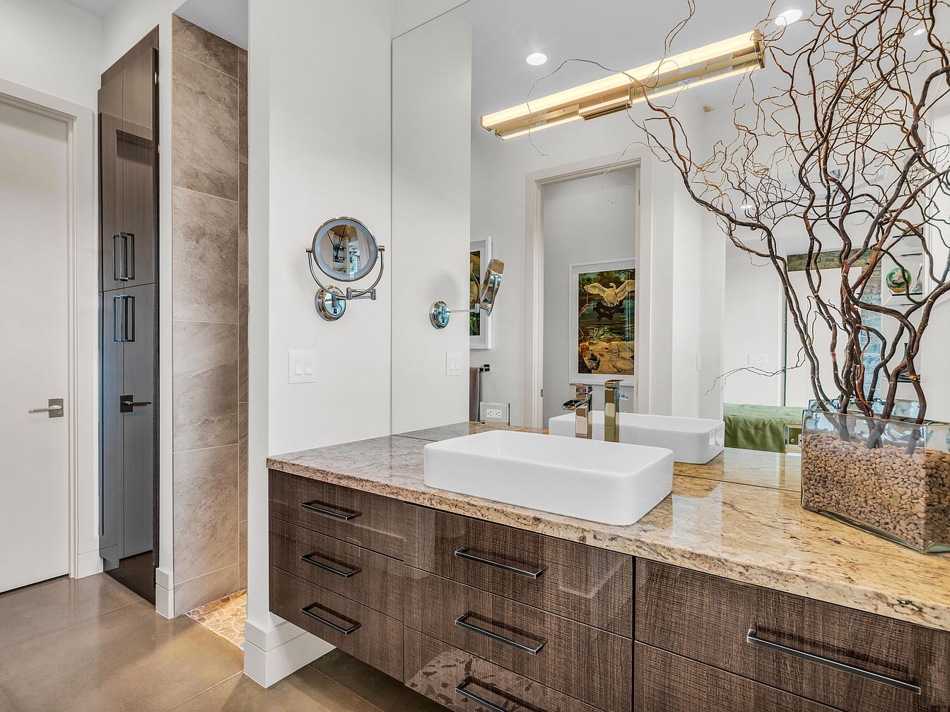 This bathroom section features a modern floating vanity with a textured dark wood finish and sleek horizontal handles. The countertop is polished granite with beige and brown tones, complementing the neutral color scheme. A large mirror runs the length of the vanity, enhancing the sense of space and reflecting soft ambient lighting from a linear wall fixture above. A white rectangular vessel sink with a streamlined chrome faucet adds contemporary elegance. To the side, a round adjustable magnifying mirror is mounted on the wall. Decorative natural branches in a glass container introduce an organic element, blending style with functionality.