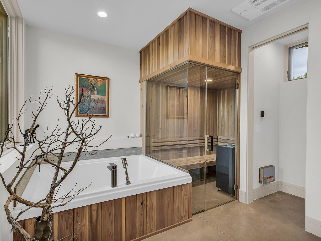 This luxurious bathroom features a spacious built-in bathtub bordered by natural wood paneling that adds warmth and texture. Beside the bathtub is a modern sauna enclosed in glass with wooden interiors, emphasizing a spa-like atmosphere. The room’s color palette is neutral, with white walls and soft wood tones contrasted by industrial polished concrete floors. Natural light enters through a small window, enhancing brightness. A minimalistic art piece adorns the wall above the tub, and a unique decorative branch arrangement introduces an organic element, balancing modern design with natural accents for a serene and inviting ambiance.