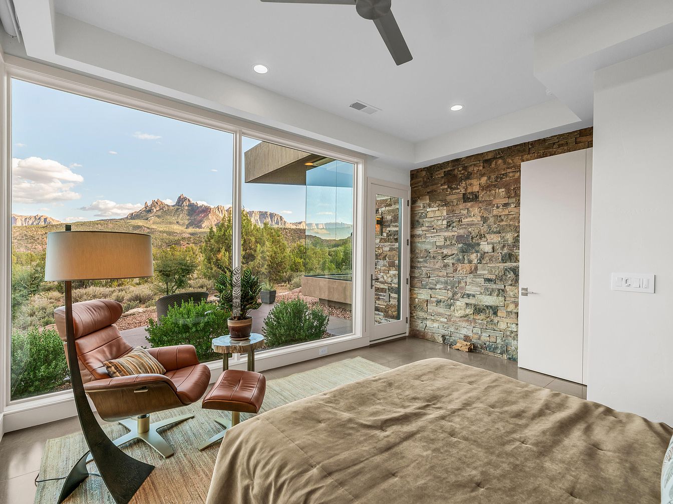 This bedroom offers a serene retreat characterized by its expansive floor-to-ceiling window, which frames breathtaking mountain and desert scenery. The space embraces a neutral palette with soft beige bedding and creams, complemented by the natural stone accent wall that adds texture and earthiness. A modern leather lounge chair paired with a matching ottoman and a slim floor lamp create a cozy corner for relaxation. The room’s minimalist aesthetic is enhanced by clean white walls, recessed ceiling lights, and a sleek ceiling fan, promoting comfort while emphasizing connection to the stunning outdoor landscape.