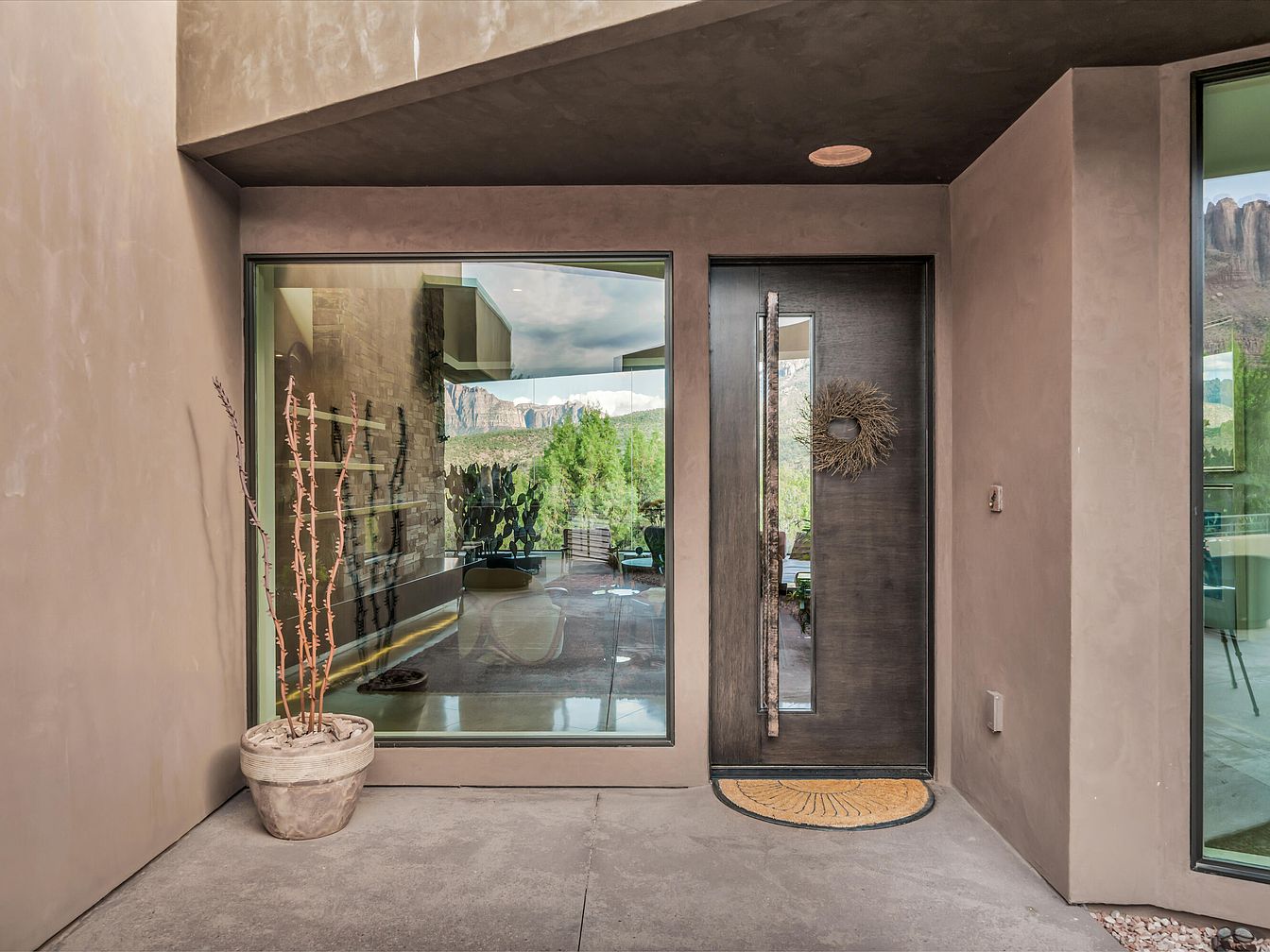 This front entryway features a minimalist design with clean lines and a muted earth-tone color palette. The walls and ceiling are finished in a smooth, matte taupe, complementing the warm concrete floor. A large, dark wood front door with a vertical glass inset and natural textured wreath adds subtle character. Adjacent to the door is a generous, floor-to-ceiling window that offers a glimpse into the interior while reflecting scenic outdoor views. A large stone pot with tall, bare branches brings an organic touch, emphasizing the seamless blend between modern architecture and nature.