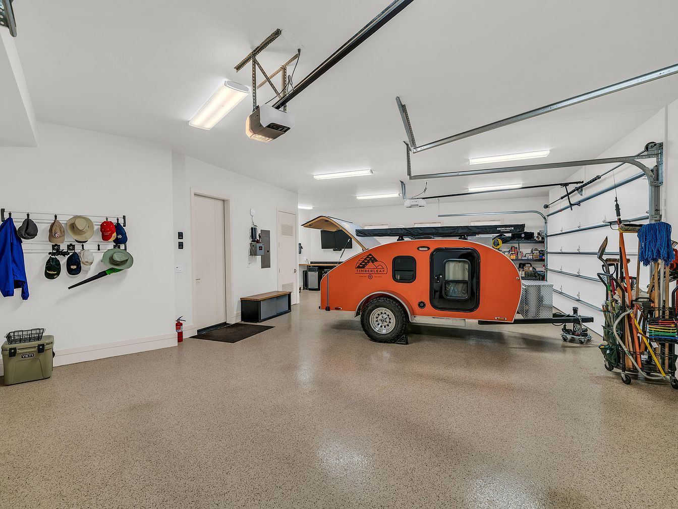 This spacious garage is impeccably organized, featuring a clean, speckled epoxy floor that enhances its brightness and durability. The white walls and ceiling reflect the overhead fluorescent lighting, creating a well-lit environment. On the left, a wall-mounted rack holds various hats and jackets, while a sturdy Yeti cooler and a basket sit beneath it. The center area prominently displays a compact, bright orange Timberleaf camper trailer, highlighted by its modern design and black-trimmed windows. To the right, multiple tools and cleaning supplies are neatly arranged on a wheeled cart and shelving, emphasizing functional storage and easy access. Minimalist white doors lead into the home, maintaining a streamlined aesthetic.
