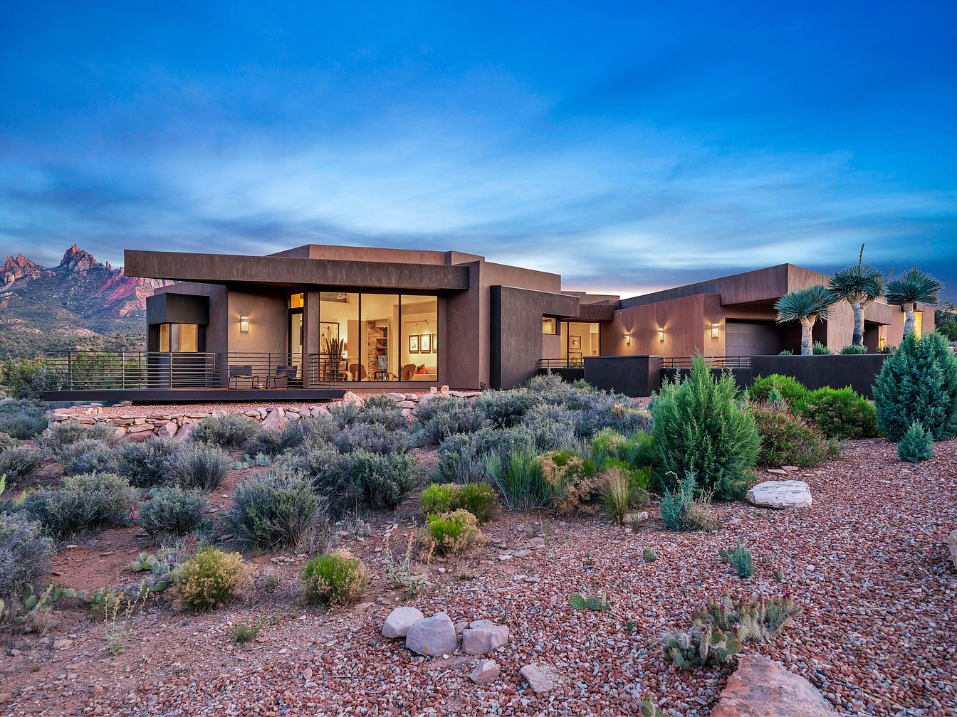 This striking modern home embraces a flat-roof design with clean, geometric lines that harmonize with the rugged desert landscape surrounding it. Earth-toned stucco walls blend naturally with the rocky, desert flora in the foreground, enhancing the integration of architecture and environment. Expansive floor-to-ceiling windows illuminate the interior spaces while inviting breathtaking views of the distant mountain peaks. The exterior lighting fixtures softly highlight the home’s textured surfaces during twilight hours, and a sleek balcony with minimalist railings extends from the living spaces for outdoor relaxation and appreciation of the vast open sky.