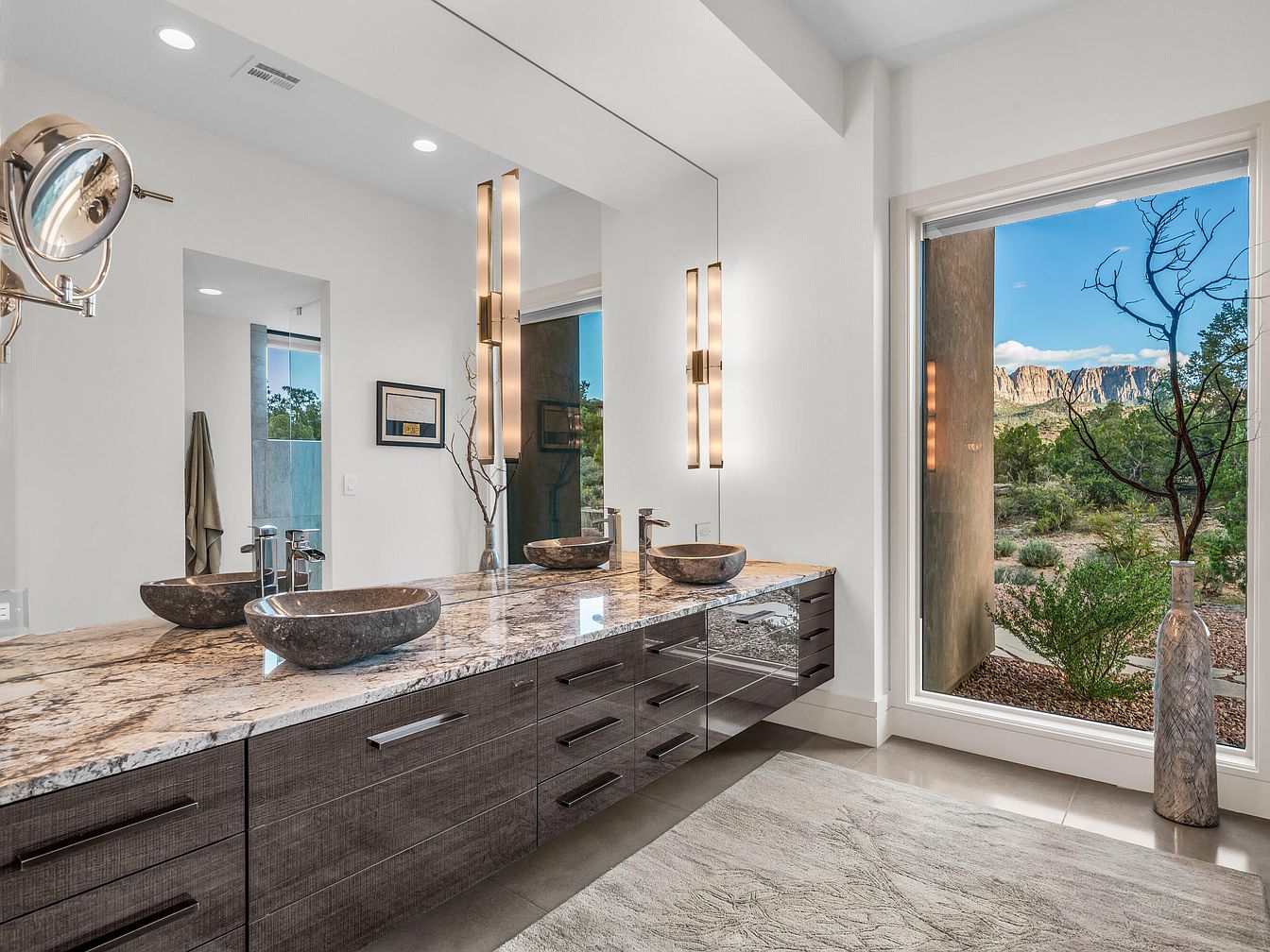 The bathroom features a long, floating vanity with dark wood cabinetry and sleek horizontal handles. A polished granite countertop with natural stone vessels adds a luxurious touch. Two modern vertical sconces flank a full-width mirror, providing ample, soft lighting for grooming. The space is painted in crisp white, enhancing brightness and a clean, minimalist feel. A large floor-to-ceiling window offers an unobstructed view of an arid landscape with rocky cliffs and greenery, bringing a sense of tranquility and connection to nature. A tall decorative vase with bare branches complements the serene, elegant aesthetic.