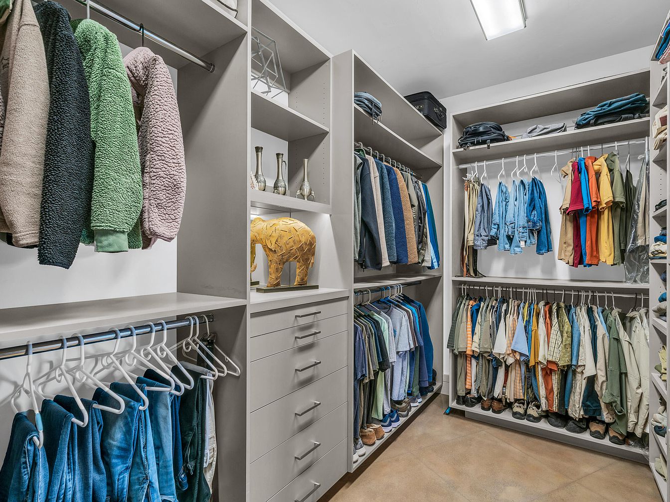 This walk-in closet features a well-organized, spacious layout with light gray built-in shelving and drawers. Multiple hanging rods accommodate a mix of clothing, from jackets and shirts to pants, all neatly arranged by type and color. Open shelving sections display decorative elements like a golden elephant sculpture and tall metallic vases, adding a touch of personality and elegance. The concrete floor contrasts subtly with the muted tones of the closet structure, providing a modern, clean aesthetic. The space is designed for functionality and visual appeal, optimizing storage while maintaining a calm, orderly environment.