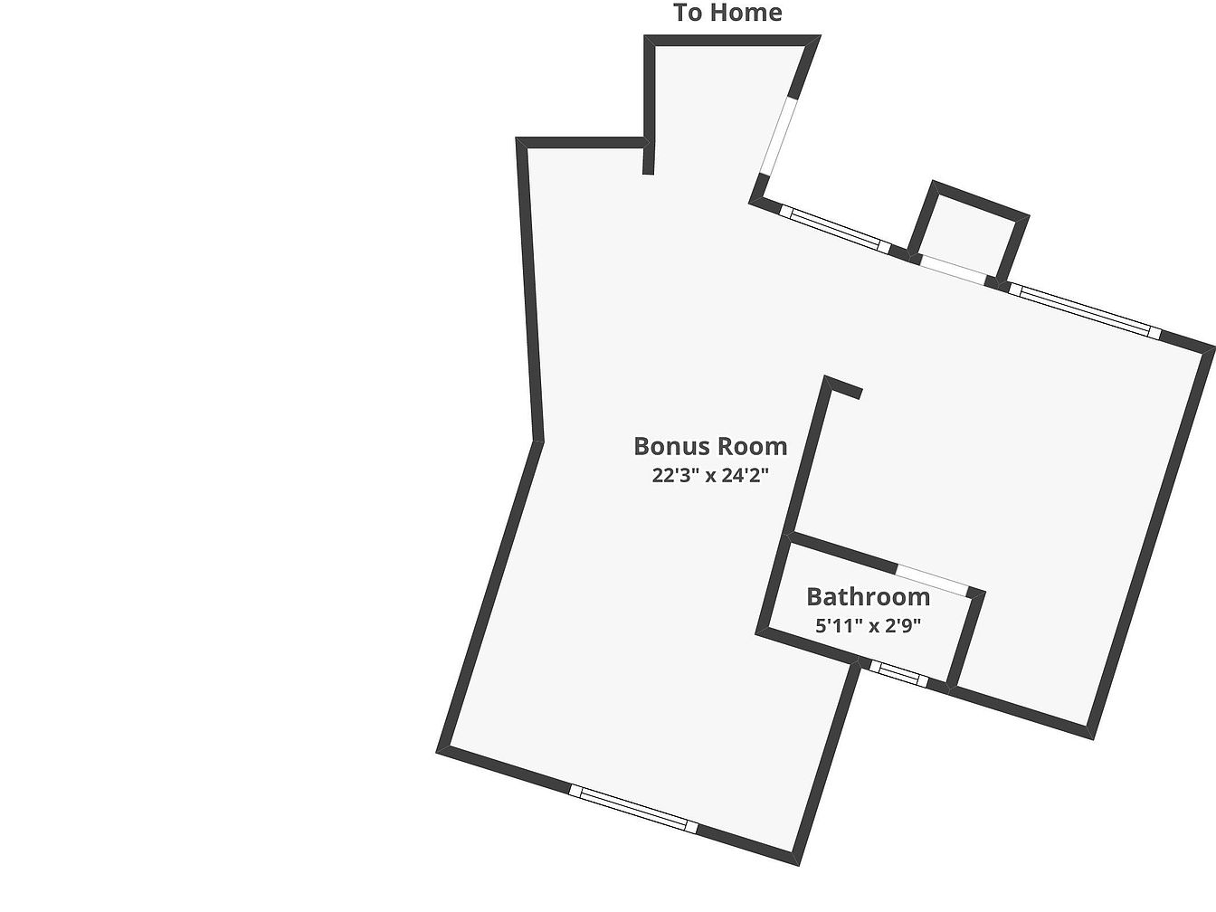This layout reveals a spacious bonus room measuring 22 feet 3 inches by 24 feet 2 inches, offering versatile space for various activities or additional living quarters. Attached is a smaller bathroom sized 5 feet 11 inches by 2 feet 9 inches, providing convenient amenities within the area. The irregular shape of the bonus room adds character and offers potential design interest. The access point labeled “To Home” indicates connectivity to the main living areas. This floor plan suggests a flexible, multi-functional space ideal for recreation, guests, or a private retreat, complete with its own bathroom for added convenience.