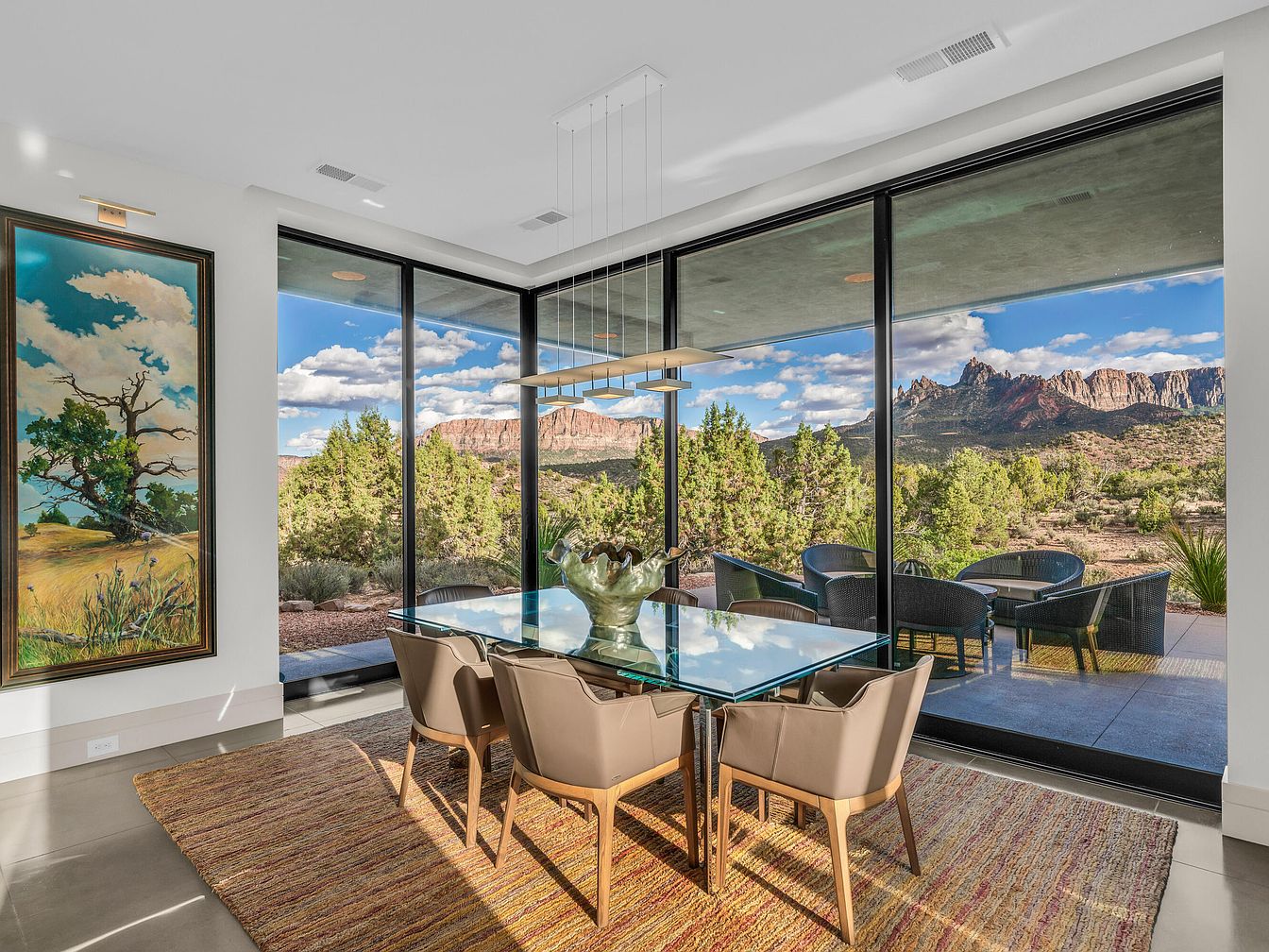 This dining area is designed to maximize natural light and breathtaking views, featuring floor-to-ceiling glass walls that frame a stunning mountainous landscape with lush greenery and a clear blue sky. The modern glass dining table with beige leather chairs adds a sleek yet comfortable touch, set upon a textured, warm-toned area rug that complements the natural hues outside. Above the table, a minimalist, linear pendant light fixture creates a focal point without detracting from the scenery. A large, vibrant painting depicting a tree scene ties the indoor space with the outdoor environment, enhancing the room’s airy and serene atmosphere.
