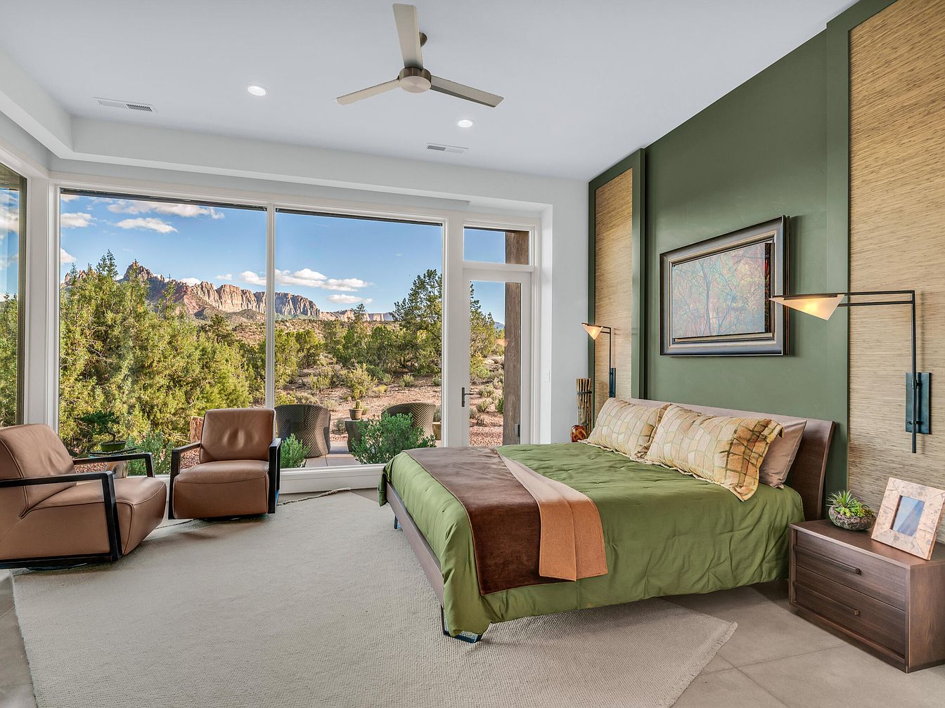 This spacious bedroom features a commanding view of a natural landscape through floor-to-ceiling windows, blending indoor comfort with the outside environment. The color scheme emphasizes earth tones, with a green accent wall behind the bed and nature-inspired artwork. The bed is dressed in matching green bedding with brown and beige accents, complementing the wooden bed frame and nightstand. Two sleek leather armchairs are positioned near the window, inviting relaxation while enjoying the view. Minimalist wall-mounted lamps provide soft lighting, and the room’s neutral carpet and ceiling fan add to the modern yet cozy atmosphere.