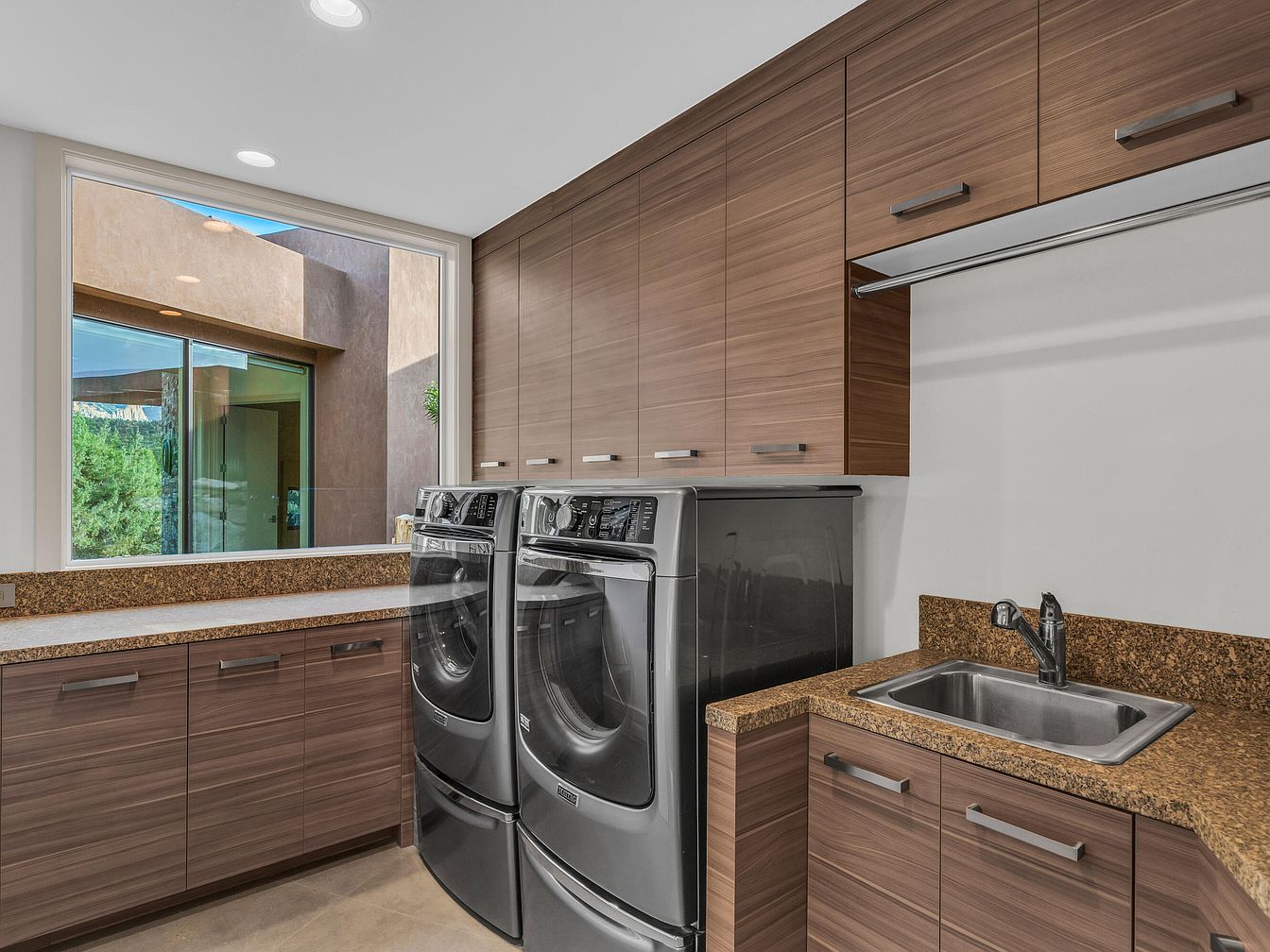 This functional laundry room showcases a modern design with sleek, dark stainless-steel washer and dryer set perfectly nestled under a rich walnut-toned cabinetry system. The abundant storage cabinets extend across the walls, offering ample space for organization. The countertops are covered with a warm brown, speckled granite surface that complements the wood grain texture of the cabinets. A practical stainless-steel sink with a modern faucet is embedded into the countertop on the right. Natural light floods in through a large window, highlighting the clean lines and neutral beige flooring, creating a bright yet cozy utility space.