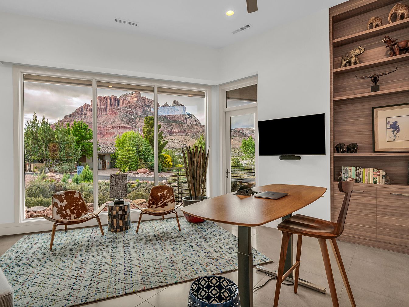 This home office features a clean, modern layout with a primary focus on the expansive window that offers a stunning, unobstructed view of rugged red rock mountains and lush greenery outside. The room includes a sleek wooden standing desk paired with a matching chair, emphasizing natural wood tones complemented by a built-in shelving unit with decorative items and books. Two low-profile chairs with a cowhide pattern face the windows, positioned on a large patterned area rug that adds subtle color and texture. Neutral wall colors keep the space bright and airy. A mounted flat-screen TV and glass door leading outdoors complete the stylish, functional setting.