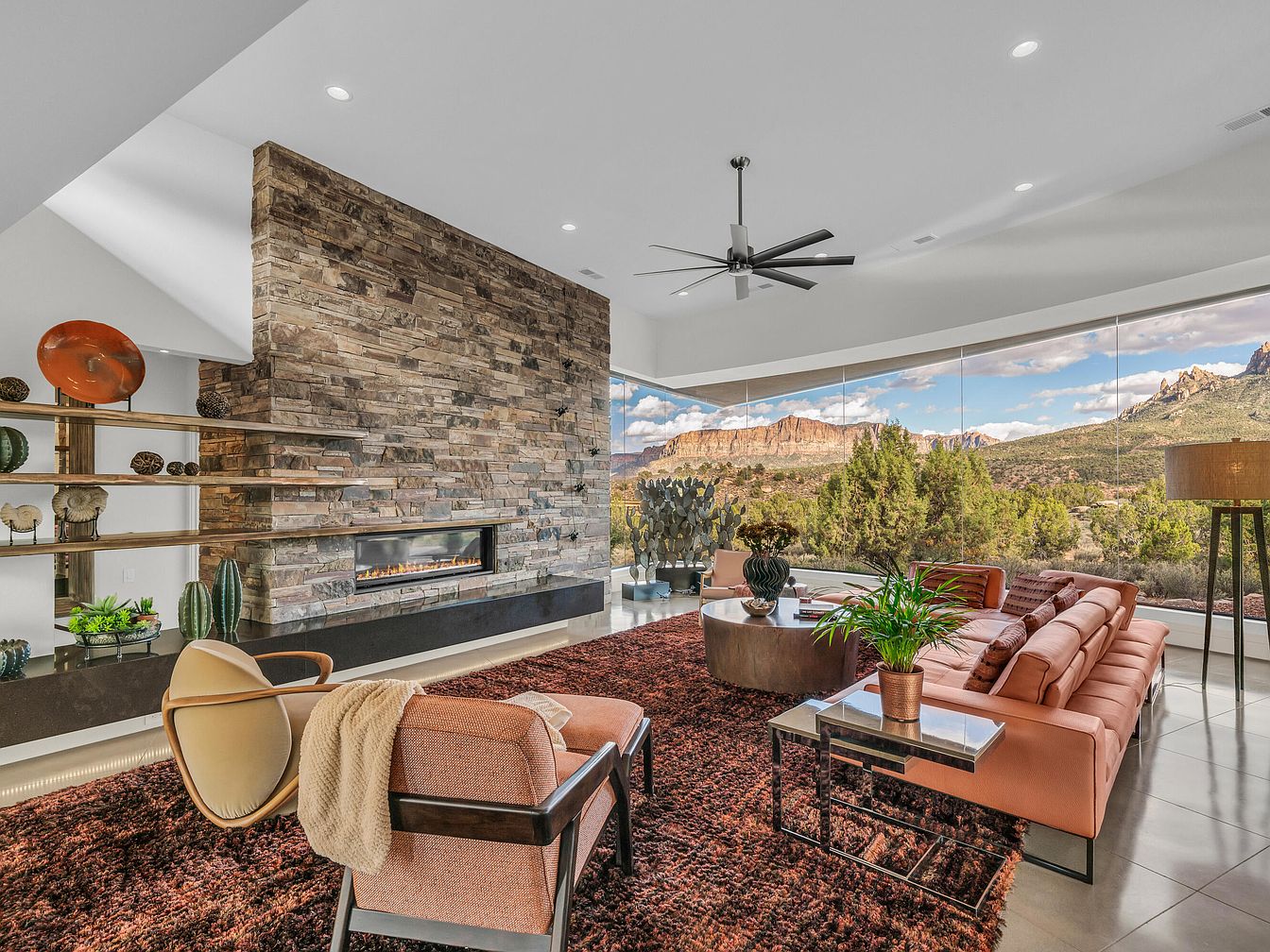This spacious living room is defined by its striking floor-to-ceiling stone fireplace, which adds warmth and natural texture. Large panoramic glass windows offer an expansive, uninterrupted view of rugged mountain landscapes and greenery, seamlessly blending indoor and outdoor environments. The color scheme features earthy tones with a soft, dusty rose sectional sofa and matching armchair placed on a deep rust-colored shag rug, adding comfort and visual depth. Modern metallic accents appear in the sleek side table and round coffee table, while greenery and decorative objects on open wooden shelves introduce subtle organic details. A ceiling fan with a contemporary design complements the room’s airy feel.