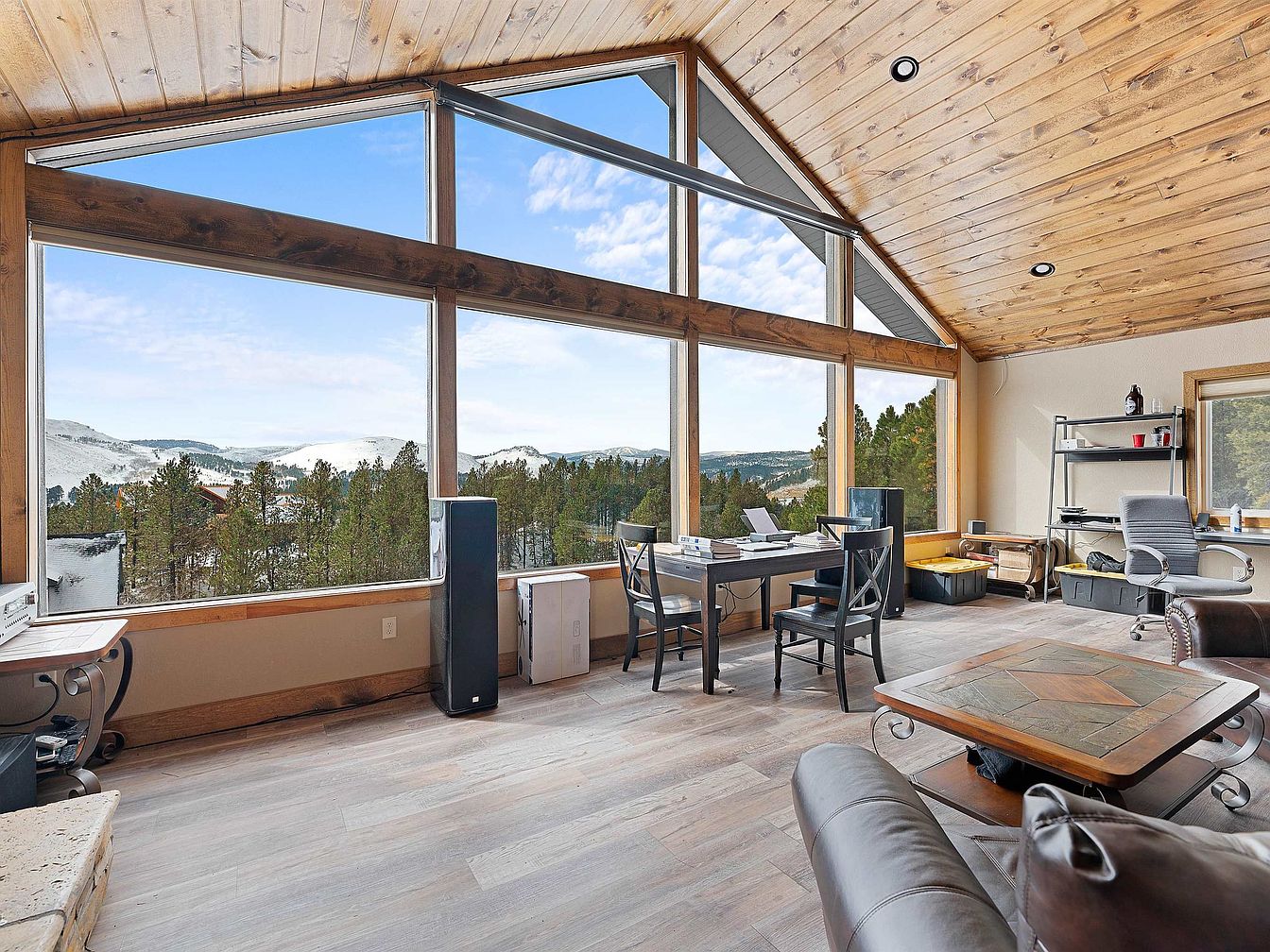 This spacious living area is defined by its expansive floor-to-ceiling windows that reveal sweeping mountain and forest views, inviting natural light to flood the space. The vaulted ceiling, clad in warm-toned wood planks, adds rustic charm and heightens the airy atmosphere. The floor features light-toned wood or laminate, complementing the ceiling’s natural finish. Furniture includes a dark wood table paired with black chairs arranged near the windows, likely serving as a casual dining or work space. A comfortable leather sofa and a coffee table with a decorative tile inset complete the seating area. The room blends cozy, natural elements with functional simplicity, creating a serene mountain retreat ambiance.