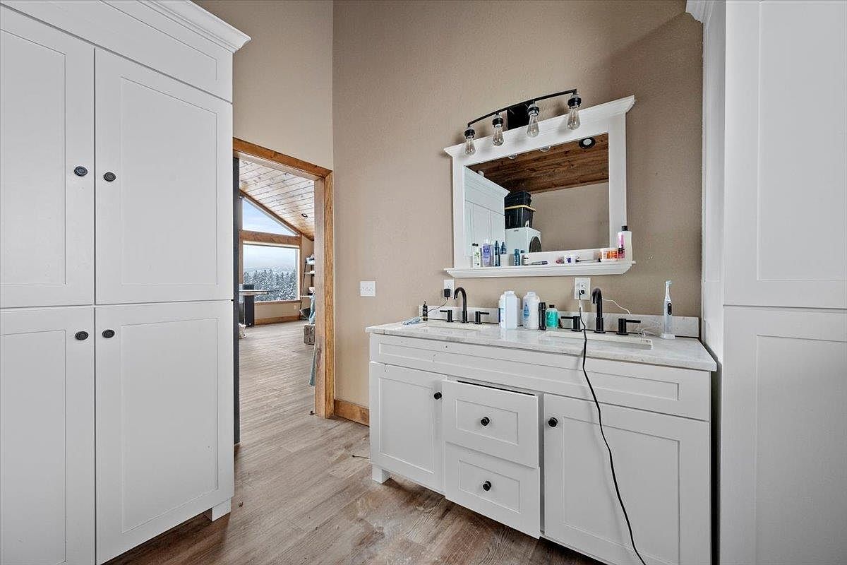 This bathroom vanity area features a clean, modern design with white cabinetry and a marble countertop. Dual sinks are fitted with matte black fixtures, creating a stylish contrast against the light tones. A large, framed mirror hangs above the sink, illuminated by an industrial-style light fixture with exposed bulbs. The walls are painted a warm beige, complementing the natural wood trim around the doorway that leads into a spacious, vaulted ceiling living area. The flooring throughout is a light wood texture, blending rustic charm with contemporary elegance in the home’s transition spaces.