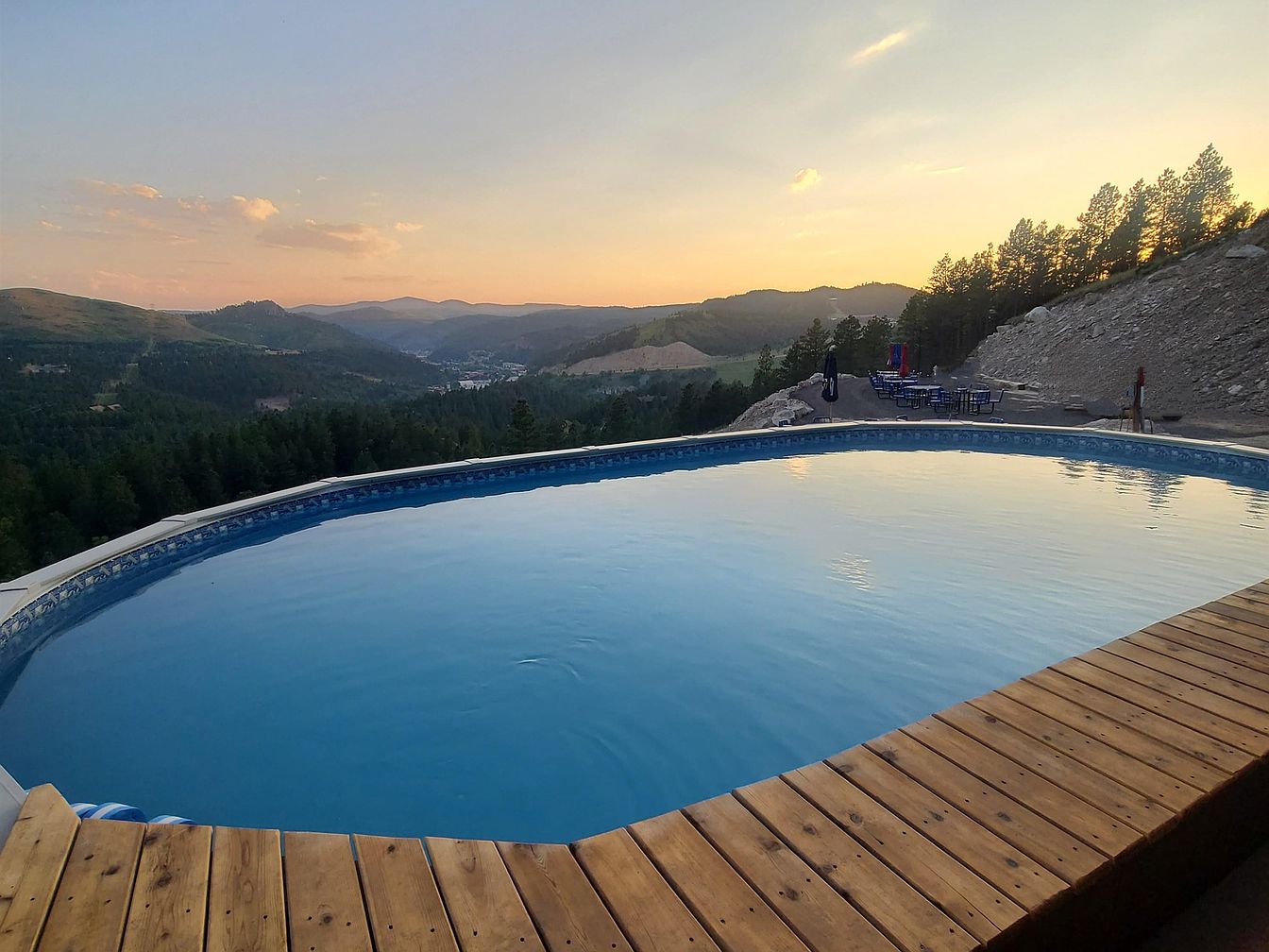 This outdoor pool area is perched on a hillside, offering expansive views of rolling forested mountains and a colorful sunset sky. The pool has a rounded edge lined with a natural-toned wooden deck that adds warmth and blends with the natural surroundings. Beyond the pool, there is a paved seating area featuring blue tables and umbrellas for relaxation or socializing. The peaceful atmosphere is enhanced by the surrounding pine trees and rugged rocky slope, making this space a serene retreat that connects the luxury of water leisure to the beauty of nature.