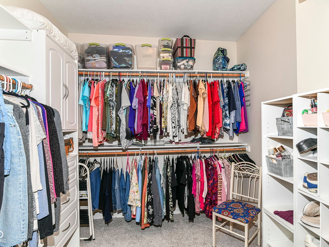 This walk-in closet boasts an efficient use of space, featuring a double-tiered hanging system for clothes with a variety of colorful garments neatly arranged on wooden rods. White shelving units border the closet, providing organized storage for shoes, accessories, and folded items. The carpeted floor adds warmth and comfort underfoot, while the chair with a floral upholstered seat offers a convenient place to sit. Neutral wall colors keep the area bright and open, complemented by practical plastic bins atop the upper shelf for additional storage. Overall, the closet balances functionality with a clean, inviting aesthetic.