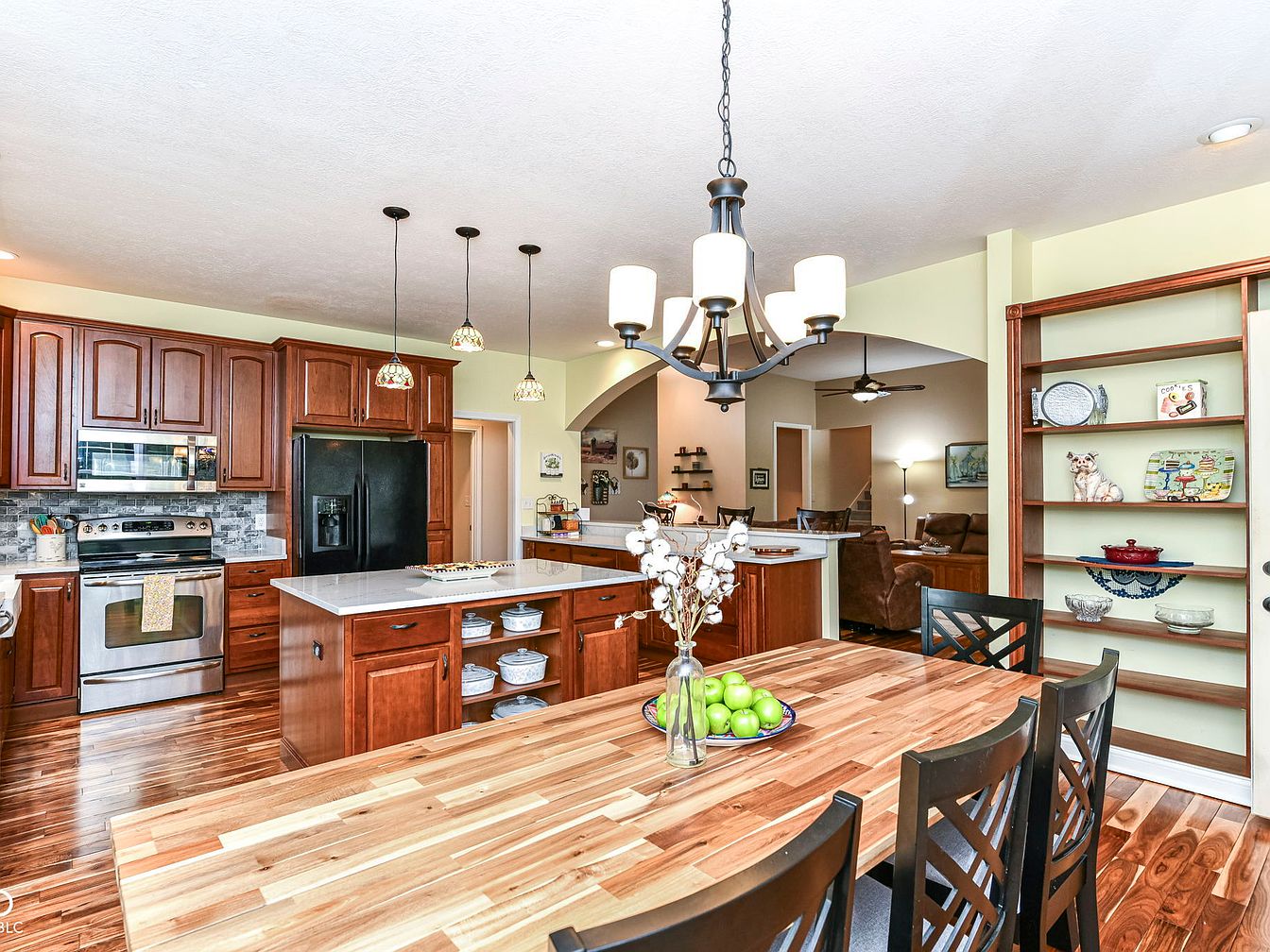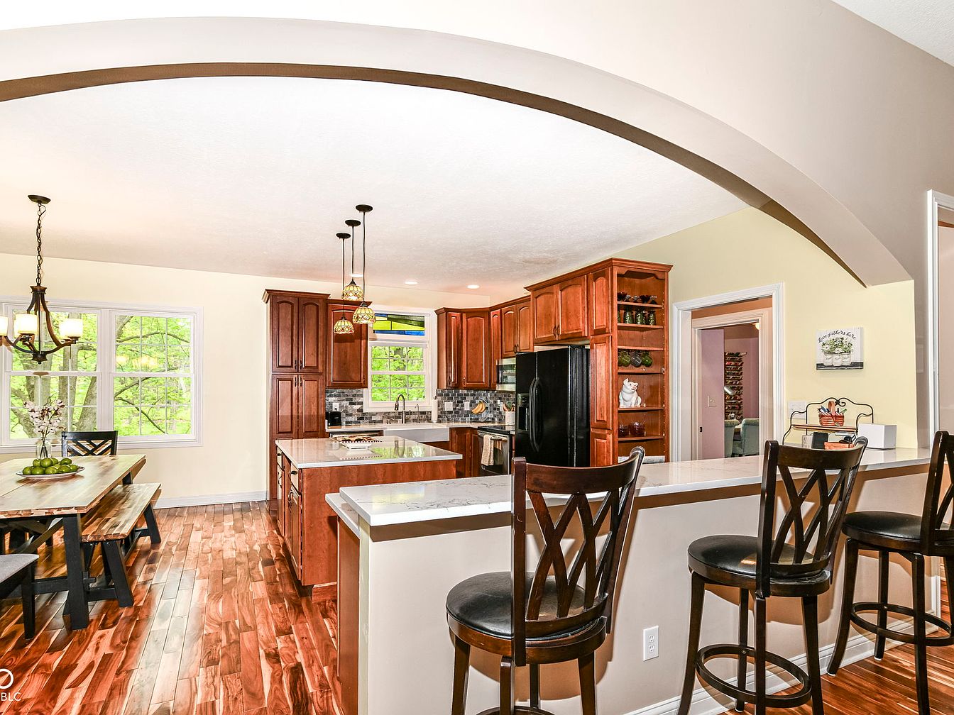 This open kitchen features rich cherry wood cabinetry paired with a contrasting black fridge, adding warmth and depth to the space. The countertops are polished in a light stone pattern, complementing the neutral beige walls. Above the center island, three pendant lights with stained glass designs add character and enhance the room’s cozy ambiance. Hardwood floors span the entire kitchen and adjacent breakfast area, where a wooden dining table is paired with a bench and chairs in a dark finish, echoing the kitchen bar stools. A large arched opening connects this space to the rest of the home, promoting an open and inviting layout.
