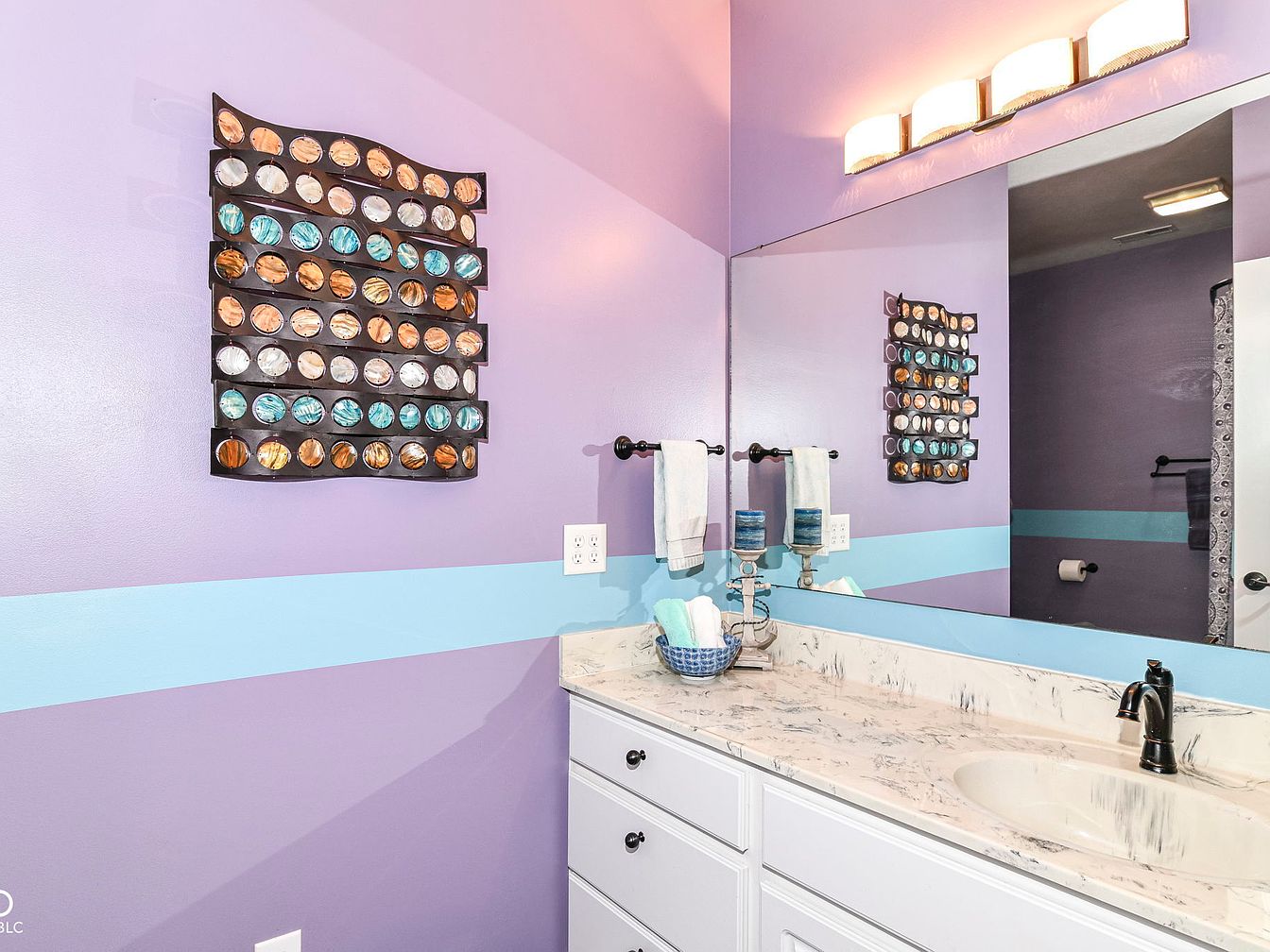 This bathroom features a stylish vanity with a broad marble countertop in soft white and gray veining, paired with classic white cabinetry below. The walls are painted lavender, accented by a horizontal aqua blue stripe that adds a refreshing contrast. A large mirror spans the countertop’s length, bordered above by modern, square light fixtures offering bright, even illumination. Decorative elements include a unique wall art piece with circular reflective and colored segments, two towel bars holding white towels, and a small bowl holding neatly rolled towels. The black faucet and accessory fixtures add a sleek touch to the design.