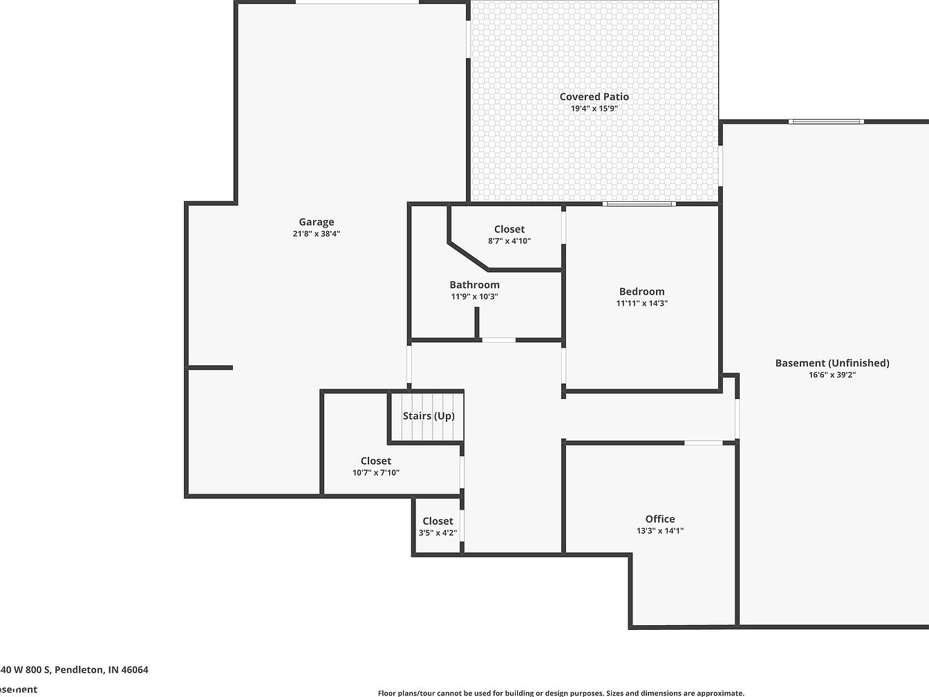 This basement floor plan reveals a spacious, multifunctional area designed for practical living and storage. It includes a large unfinished basement space measuring 16’6″ by 39’2″, ideal for future customization. Adjacent rooms include an office spanning 13’3″ by 14’1″, a bedroom of 11’11” by 14’3″, and a bathroom with an attached closet. Two additional closets by the stairs and a smaller 3’5″ by 4’2″ closet maximize storage. The covered patio at 19’4″ by 15’9″ offers outdoor access. The layout is well-planned for flexibility and utility, with a garage connected for convenience.