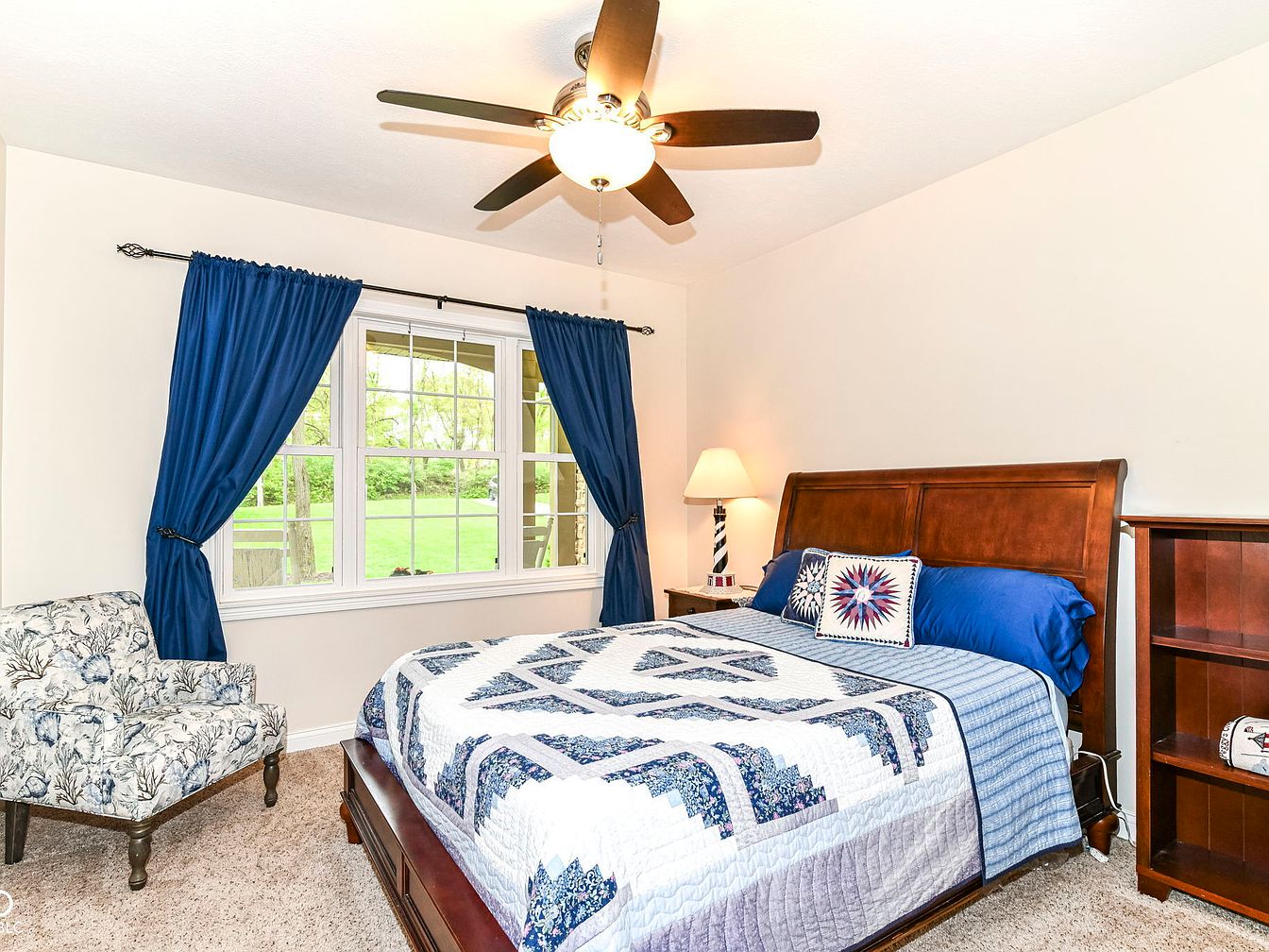 This inviting bedroom features a classic wooden bed frame with a detailed quilt showcasing blue and white geometric patterns. Deep blue curtains frame a large window that floods the room with natural light, offering a calming view of lush greenery outside. A comfortable armchair with a subtle floral pattern sits beside the window, adding a touch of elegance and relaxation. The carpeted floor enhances warmth and comfort, while a striped lamp on the nightstand provides soft lighting. The ceiling fan with dark blades is both functional and stylish, complementing the room’s clean and cozy aesthetic.