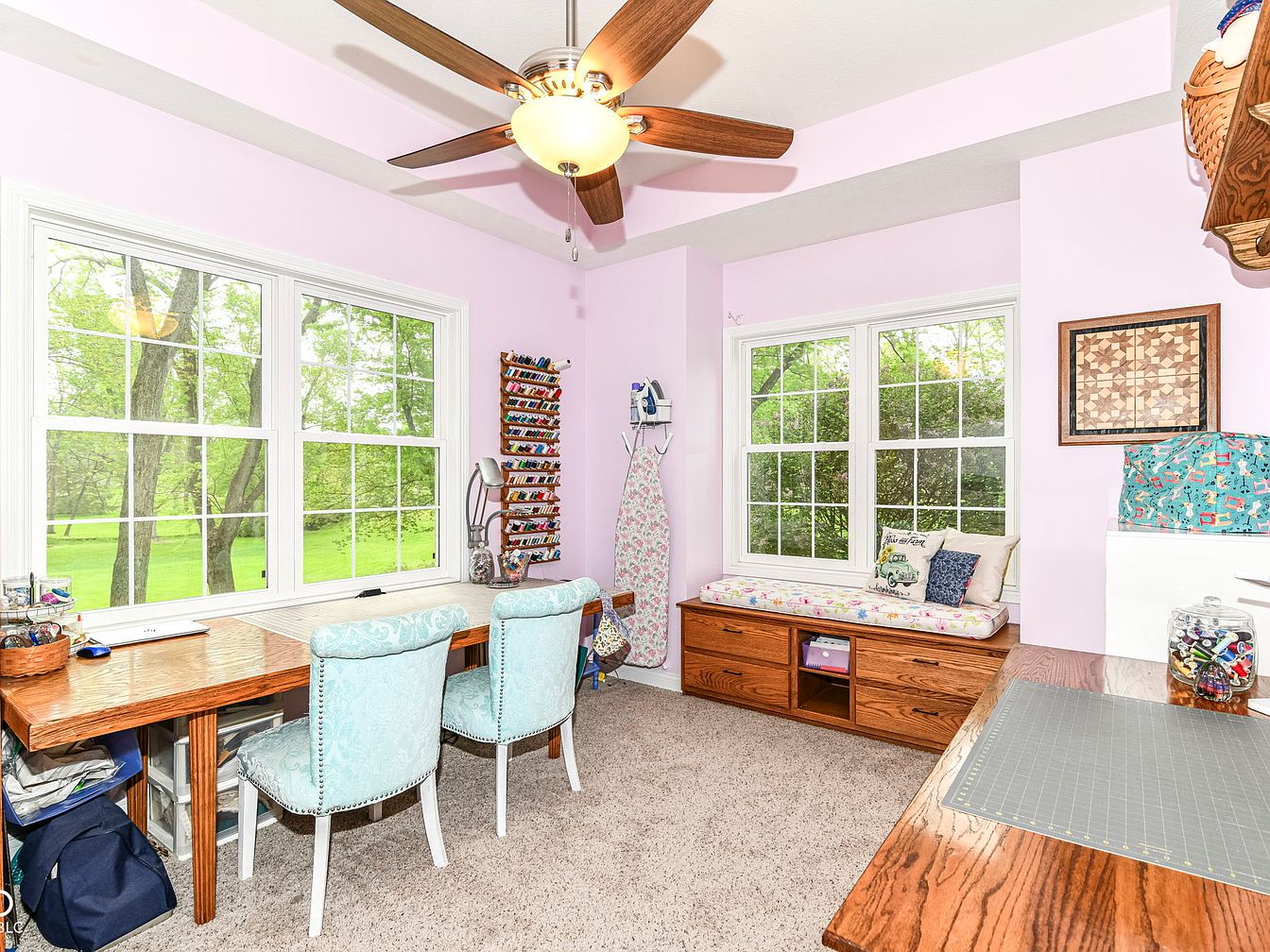 This cozy craft room is bathed in natural light from two large, multi-pane windows offering tranquil views of lush greenery outside. Walls painted in a soft pastel lavender create a calming atmosphere, complemented by a beige textured carpet. Two light blue, upholstered chairs with subtle patterns sit at a long wooden desk, ideal for detailed projects, accompanied by a peg-mounted thread storage rack and an iron with a floral print ironing board for sewing needs. A built-in wooden bench beneath the windows includes storage drawers and a floral cushion with decorative pillows, providing extra seating and functionality. The ceiling fan with wooden blades adds warmth while maintaining airflow and comfort.