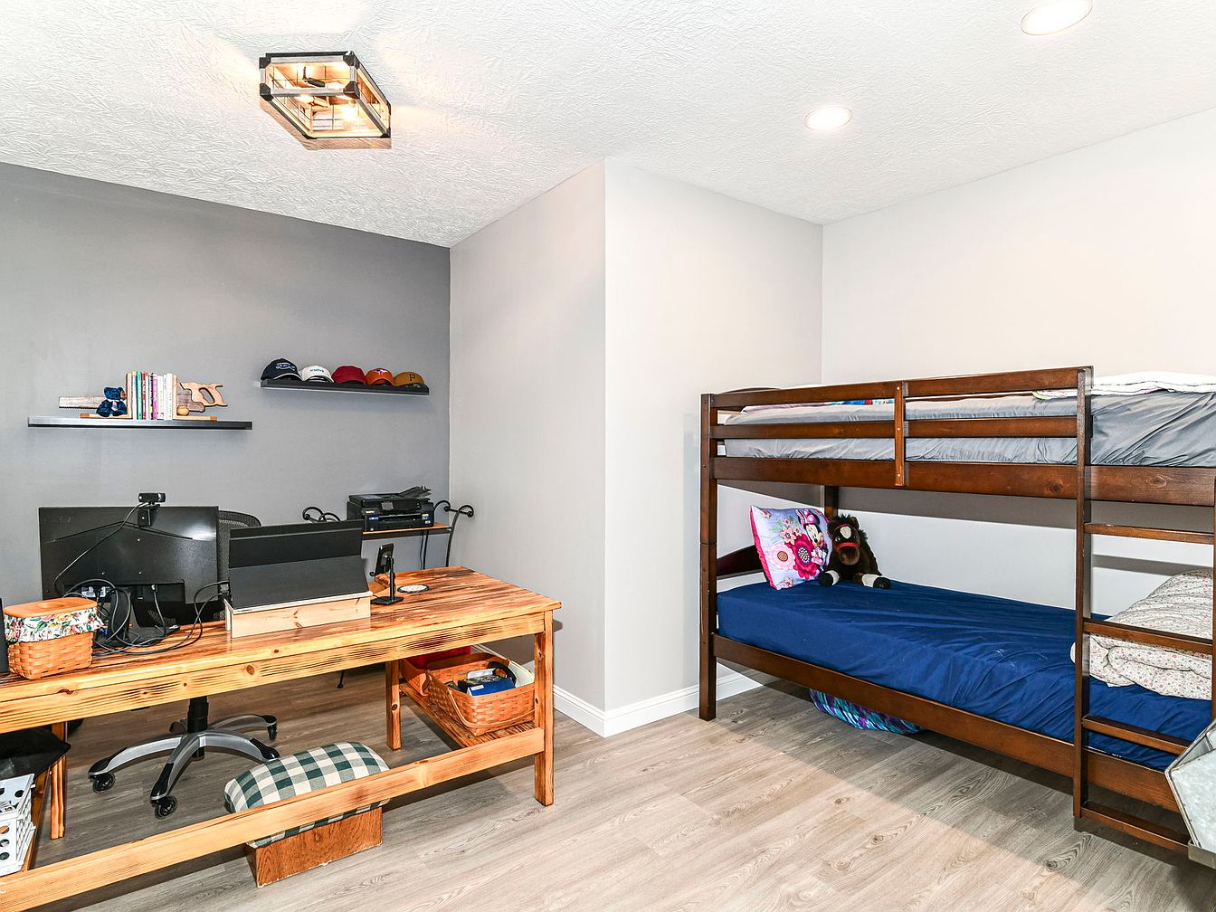 This multifunctional room features a cozy bunk bed with a dark wooden frame against a light grey wall, creating a subtle contrast. The lower bunk is dressed in a deep blue cover with a playful floral pillow and stuffed horse toy, adding a child-friendly touch. Adjacent, a large rustic wooden desk occupies the corner, supporting dual monitors and office essentials, indicating a dedicated workspace. The wall behind the desk is painted a darker grey, accentuating two minimalist floating shelves holding books and caps, contributing to the room’s organized yet personal vibe. Light wood flooring and modern ceiling fixtures complete the clean, practical space.