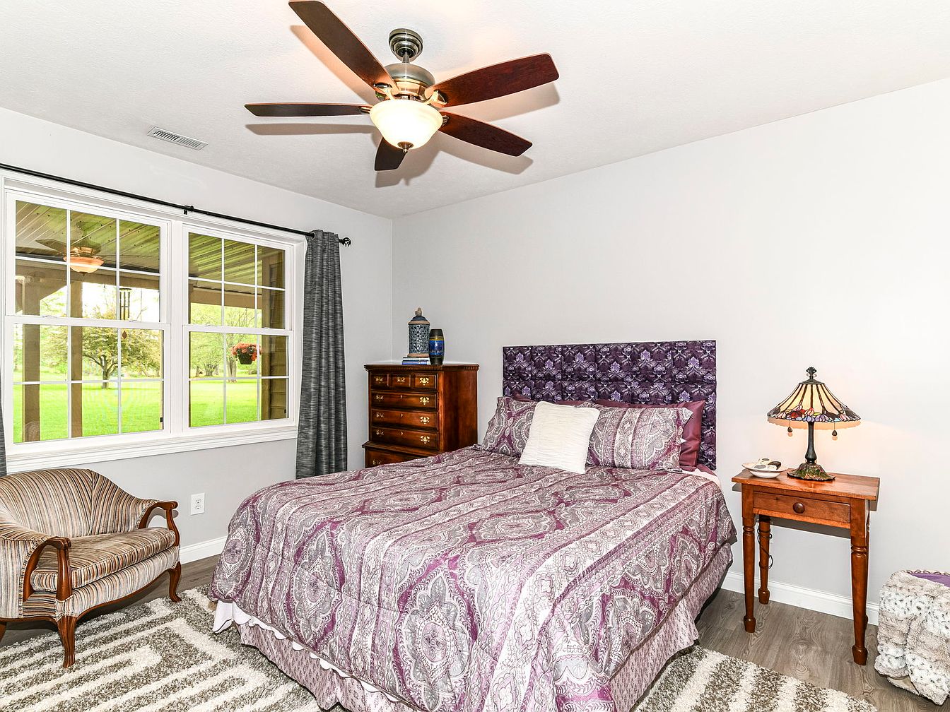 This bedroom offers a welcoming and intimate ambiance with soft, neutral wall colors enhancing natural light from the large window overlooking a lush green lawn. The bed is dressed in an intricate patterned comforter and matching pillows in hues of purple and gray, coordinated with a textured purple headboard for a cohesive look. Complementing the bed are classic wooden furnishings, including a tall chest of drawers and a small bedside table with a charming stained glass lamp. A cozy armchair with striped upholstery and a plush area rug with geometric designs complete the inviting space. The ceiling fan combines brushed metal and dark wood blades, adding a functional yet stylish ceiling element.