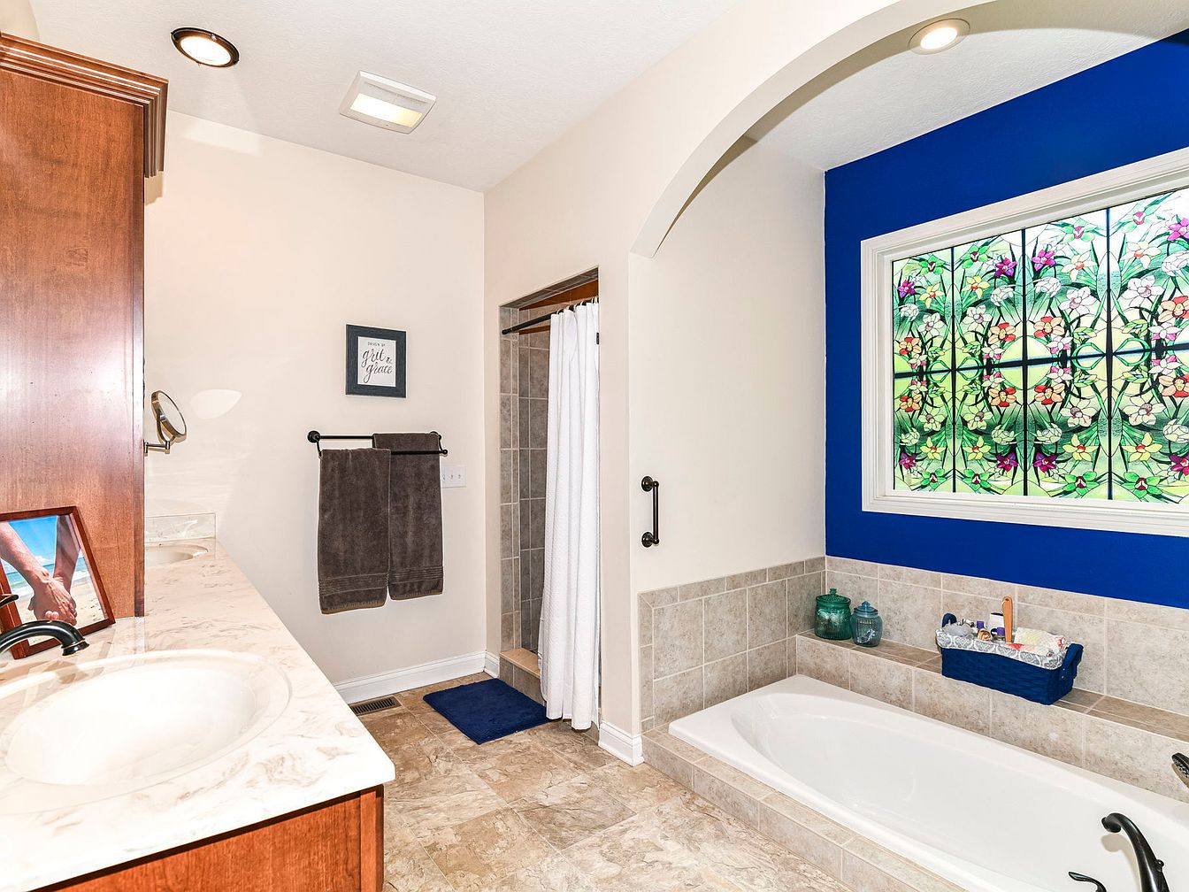 This bathroom blends classic and vibrant design elements, featuring a spacious layout with a bathtub and separate shower stall. The bathtub is bordered with neutral beige tiles complementing the floor’s marble-like appearance. A bold cobalt blue accent wall draws attention to the large stained glass window, showcasing intricate floral patterns in various colors, allowing natural light to filter through beautifully. The vanity includes a white marble countertop with dual sinks and rich wood cabinetry. Dark towels, a small framed quote, and practical fixtures offer a subtle contrast, creating a warm and inviting atmosphere.