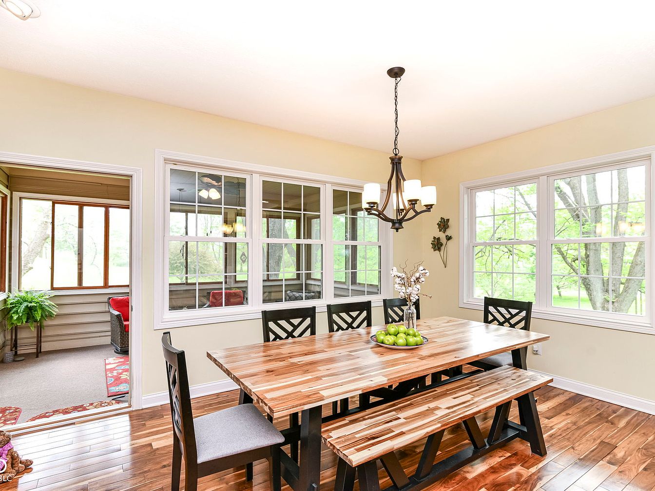 This dining space features a blend of rustic and contemporary styles with its natural wood plank dining table and bench seating supported by matte black legs. The chairs add contrast with black frames and neutral gray cushions. Walls are painted a soft cream, complementing the warm hardwood flooring beneath. Large double windows on two walls flood the room with natural light and showcase leafy outdoor views, creating an inviting atmosphere. A wrought iron chandelier with five cylindrical glass shades hangs centrally, adding a classic touch. Through a doorway, a cozy sunroom with wicker furniture and red cushions is visible.