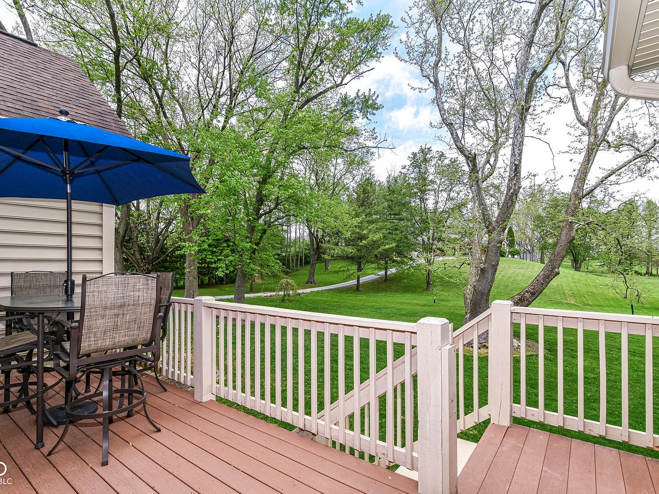This outdoor deck area offers a cozy spot for relaxation or entertaining, featuring a set of high-back bar stools around a compact, circular table. A vibrant blue umbrella provides shade and a pop of color against the neutral tones of the beige siding and white railing. The flooring is a warm, reddish-brown wood composite that adds a natural, inviting feel. The deck overlooks an expansive, lush green lawn dotted with mature trees, creating a serene landscape view. The white railing encloses the deck while complementing the house exterior, blending comfort and nature seamlessly.