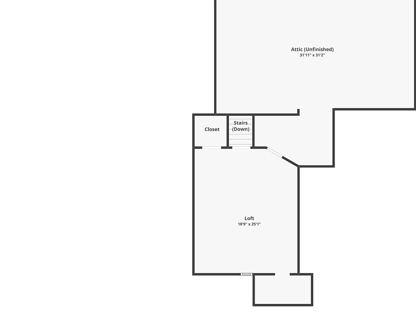 This floor plan highlights the upper level featuring a spacious loft area measuring 18’9″ by 25’1″, ideal for a flexible living space such as a family room or home office. Adjacent to the loft is an unfinished attic space of 31’11” by 31’2″, offering abundant storage or potential for future development. A conveniently located closet near the staircase provides added storage. The layout shows a straightforward design with practical usage of space, optimizing both living and storage areas on this upper level, accessed via a central staircase.