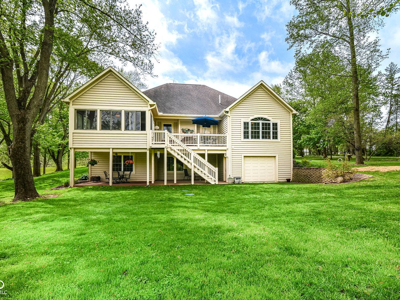 This charming country home located in Pendleton, Indiana, showcases a blend of traditional and rustic architectural styles, highlighted by its stone and siding exterior paired with a welcoming front porch featuring rocking chairs. The home is custom-built with meticulous attention to detail, featuring beautiful hardwood floors throughout. Gathering spaces include a spacious great room with a stone fireplace that flows into a large kitchen equipped with elegant cabinetry, built-in shelving, and an expansive dining area. Enjoy peaceful mornings on the screened porch overlooking a babbling creek and stunning landscaped grounds, perfect for relaxation and nature appreciation. A versatile sewing room offers potential as an office, playroom, or music room, while the primary suite boasts a huge walk-in closet, a well-appointed en suite bathroom, and lovely views of the property. The upper level includes a flexible bonus room designed for a TV area, reading nook, play space, or a possible fourth bedroom option. The walkout lower level expands living and entertaining options with an additional bedroom, full bath, office, and game room, along with a finished oversized garage that is ready to serve as a workshop, she shed, or man cave. Situated on a 2-acre plot, this peaceful property offers ample room for outdoor enjoyment and country living. The home is listed at $749,900, making it a beautiful and spacious retreat for any family.
