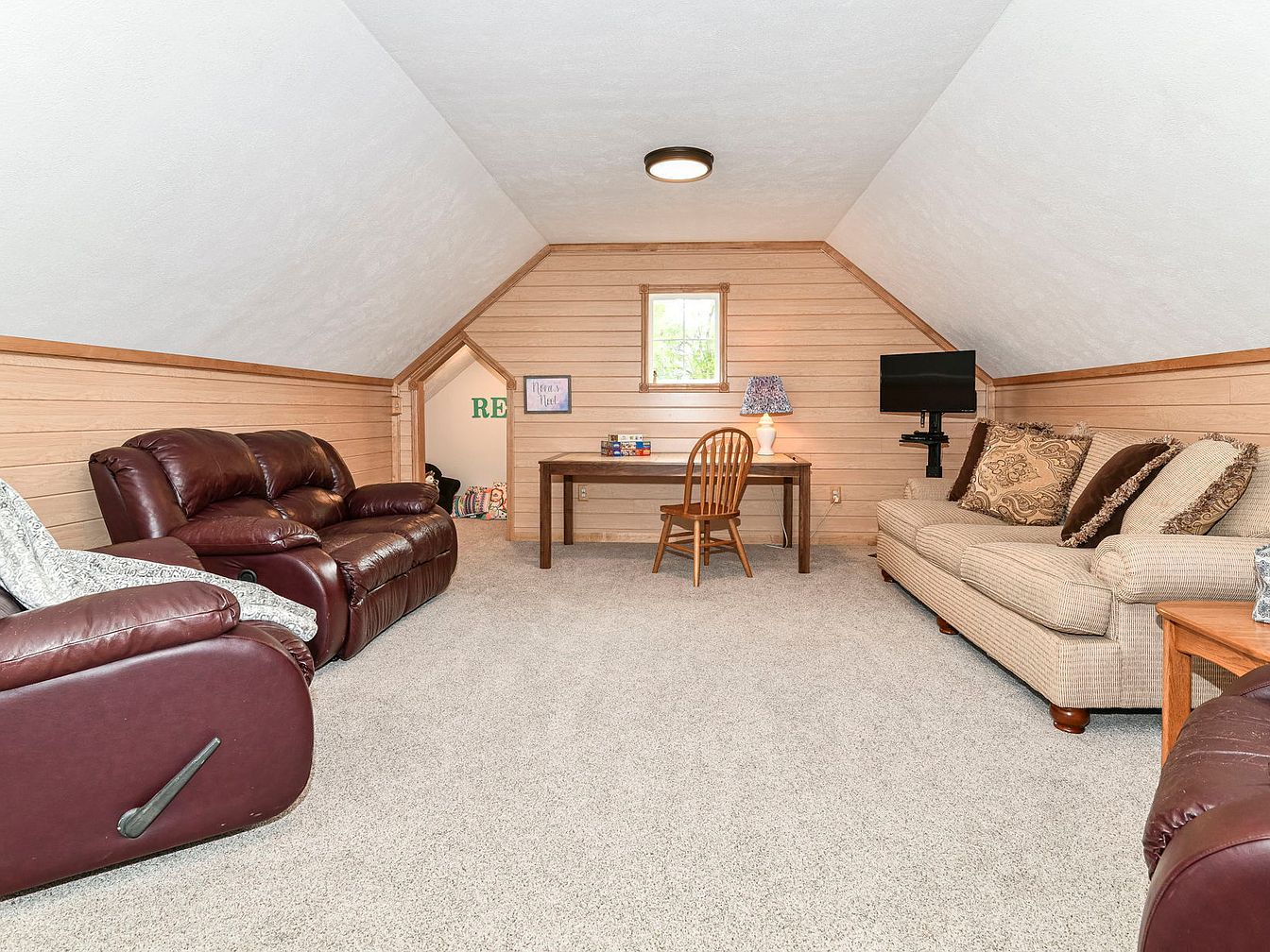 This intimate attic space is designed as a cozy lounge and workspace, with slanted white ceilings contrasting against light wooden wall panels that enhance warmth and charm. Plush carpeting underfoot adds softness and comfort. On the left, rich brown leather recliners invite relaxation, while the right side features a beige upholstered sofa adorned with textured, patterned cushions for visual interest. A simple wooden desk with a classic chair is centered beneath a small window, supplemented by a decorative table lamp producing a homely glow. A small wall-mounted TV adds entertainment, and a nook with colorful pillows hints at a playful reading or play area.