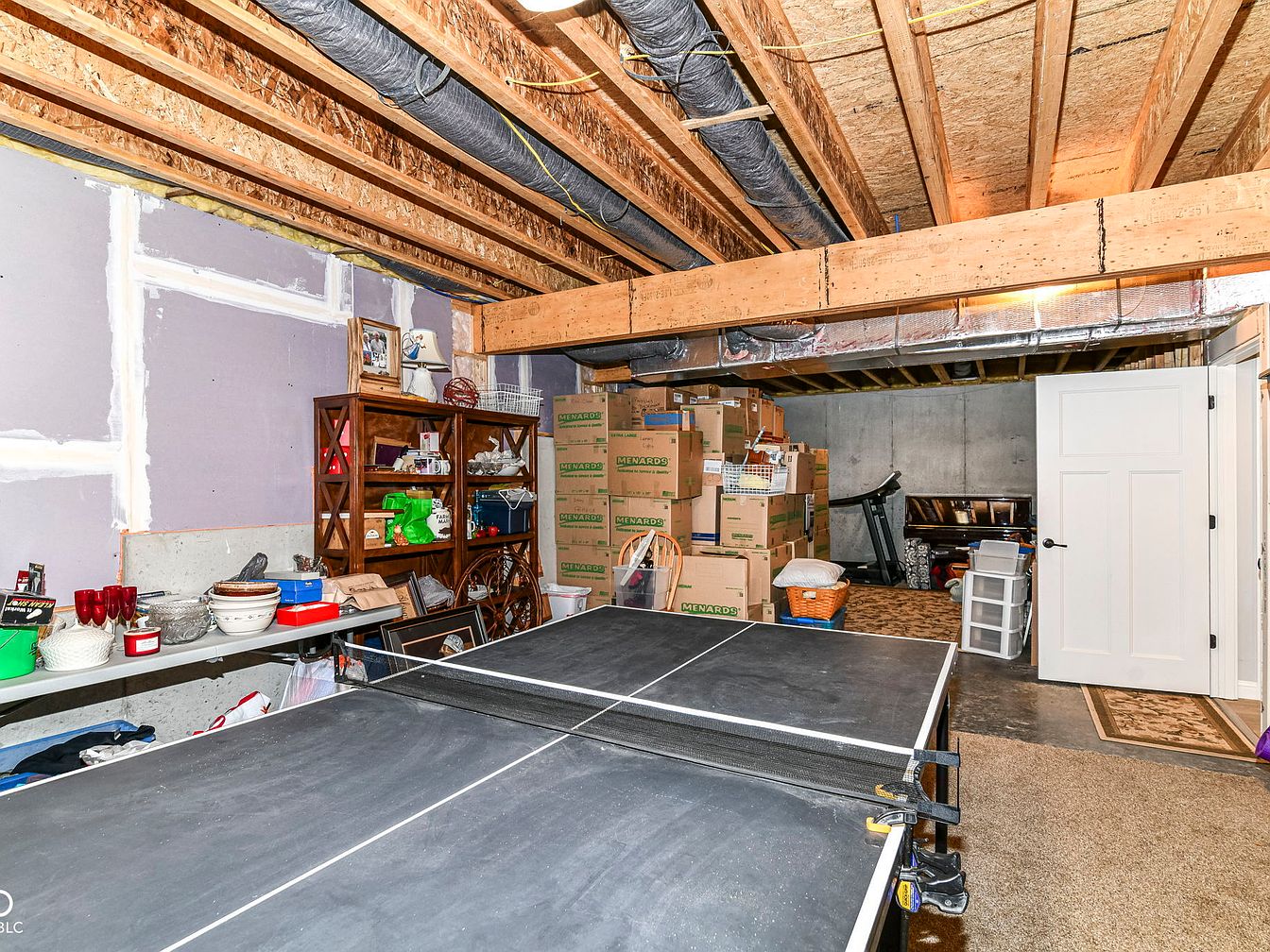 This spacious basement area is currently used for both recreation and storage. The unfinished ceiling exposes wooden beams and ductwork, giving an industrial, raw vibe. Walls are a mix of unfinished drywall and concrete. A ping pong table dominates the foreground, suggesting a casual entertainment space. Various household items and decor sit on wooden shelving against one wall, alongside numerous packed boxes stacked neatly, indicating ongoing organization or recent moving activity. The far end houses exercise equipment and a piano, highlighting multi-functional use. A white door opens into an adjacent room covered in patterned carpet, enhancing warmth in part of the basement.