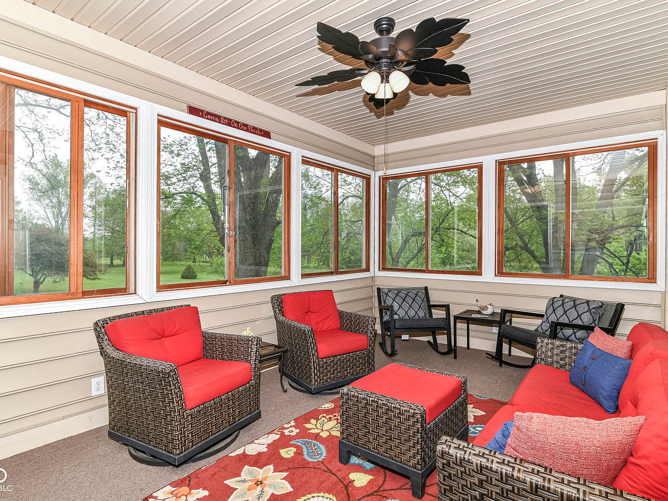 This cozy sunroom seating area is designed for relaxation and socializing, featuring expansive windows framed in warm wood tones that invite ample natural light while offering serene views of lush greenery outside. The walls and ceiling, finished in a soft beige with beadboard detailing, create a subtle, inviting ambiance. Dark woven wicker furniture with vibrant red cushions adds warmth and contrast to the space. A matching ottoman and a patterned red area rug with floral motifs further unify the seating arrangement. The black ceiling fan with leaf-shaped blades brings a touch of nature indoors and adds comfort.