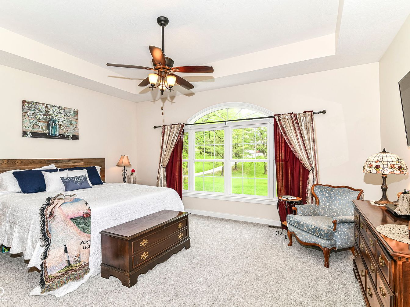 This spacious master bedroom features a serene color palette dominated by light cream walls and soft gray carpeting. The tray ceiling adds architectural interest, complemented by a ceiling fan with dark wooden blades and warm light fixtures. A large arched window floods the room with natural light, framed by rich burgundy and patterned beige curtains. The bed is dressed in crisp white bedding, accented with navy and gray pillows and a scenic throw blanket. Antique-style wooden furniture, including a chest at the foot of the bed, a dresser, and a blue upholstered armchair with floral pattern, bring warmth and classic charm to this comfortable retreat.