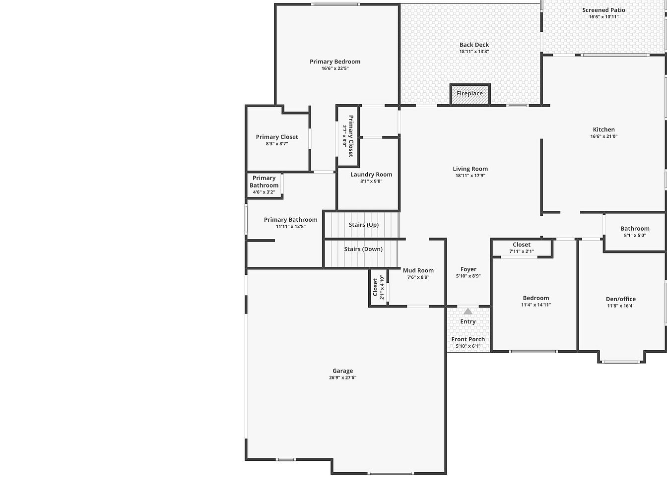 This floor plan presents a spacious and thoughtfully designed single-level home with a clear division of functional areas. The layout includes a primary bedroom with two adjacent closets and a large primary bathroom, emphasizing privacy and comfort. Central to the home is the living room, which connects to a back deck and screened patio featuring a fireplace, perfect for indoor-outdoor living and entertaining. The kitchen, generously sized, sits close to a den or office and a guest bedroom with nearby bathroom access. A mudroom, laundry room, and garage enhance utility, while the foyer and front porch provide a welcoming entry sequence. The design balances open living spaces with private, practical areas.