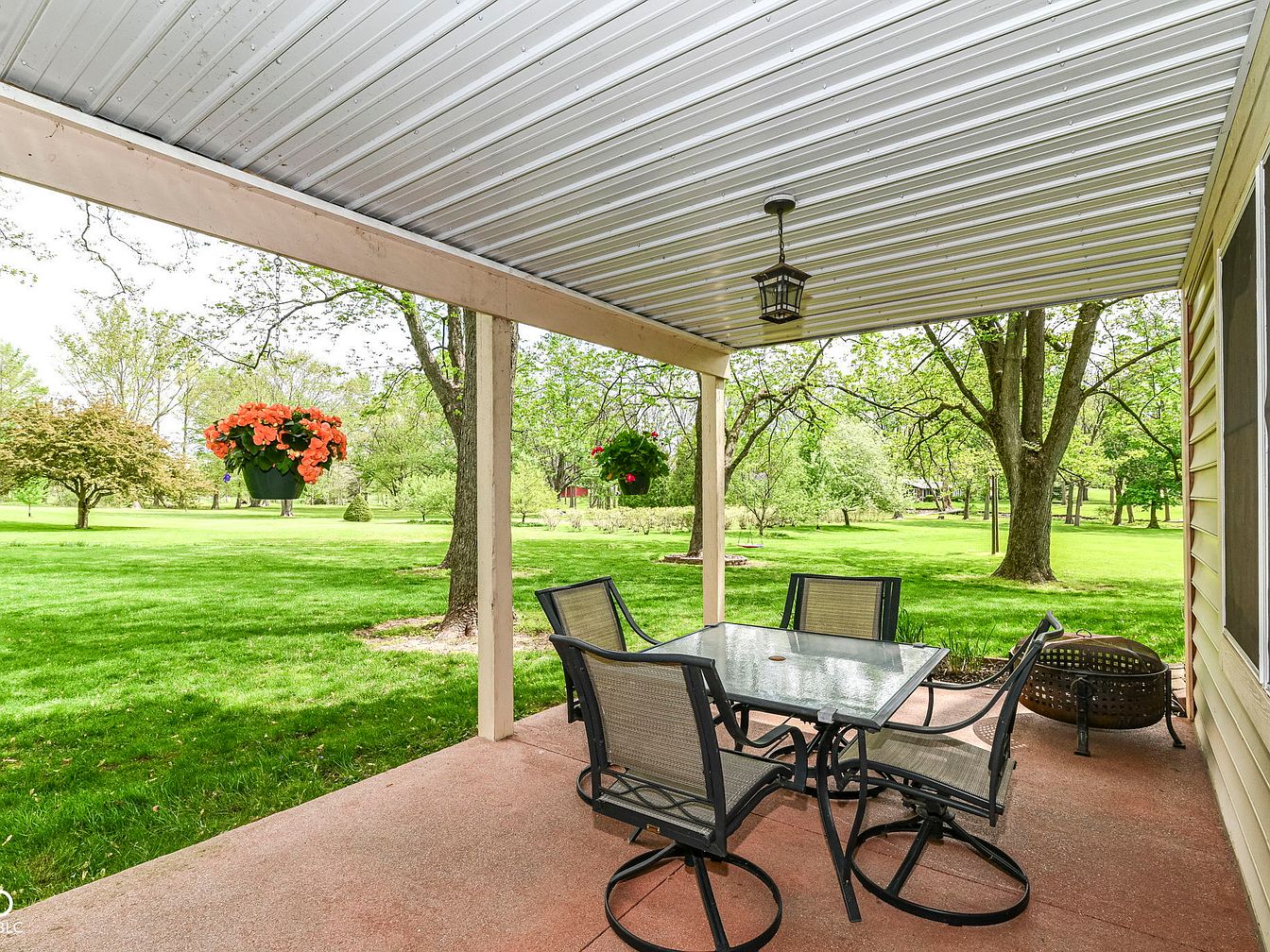 This inviting covered patio offers a tranquil outdoor dining space with a rectangular glass-top table and four metal-frame chairs featuring mesh backs and seats in a neutral tone. The patio floor is a warm-toned concrete that complements the soft beige siding of the home. The ceiling is finished with white corrugated metal panels, providing a modern yet practical cover overhead, along with a decorative hanging lantern-style light in the center. Two vibrant hanging flower baskets add pops of color, while the expansive green lawn and mature trees surrounding the area create a serene, park-like atmosphere perfect for relaxing or entertaining.