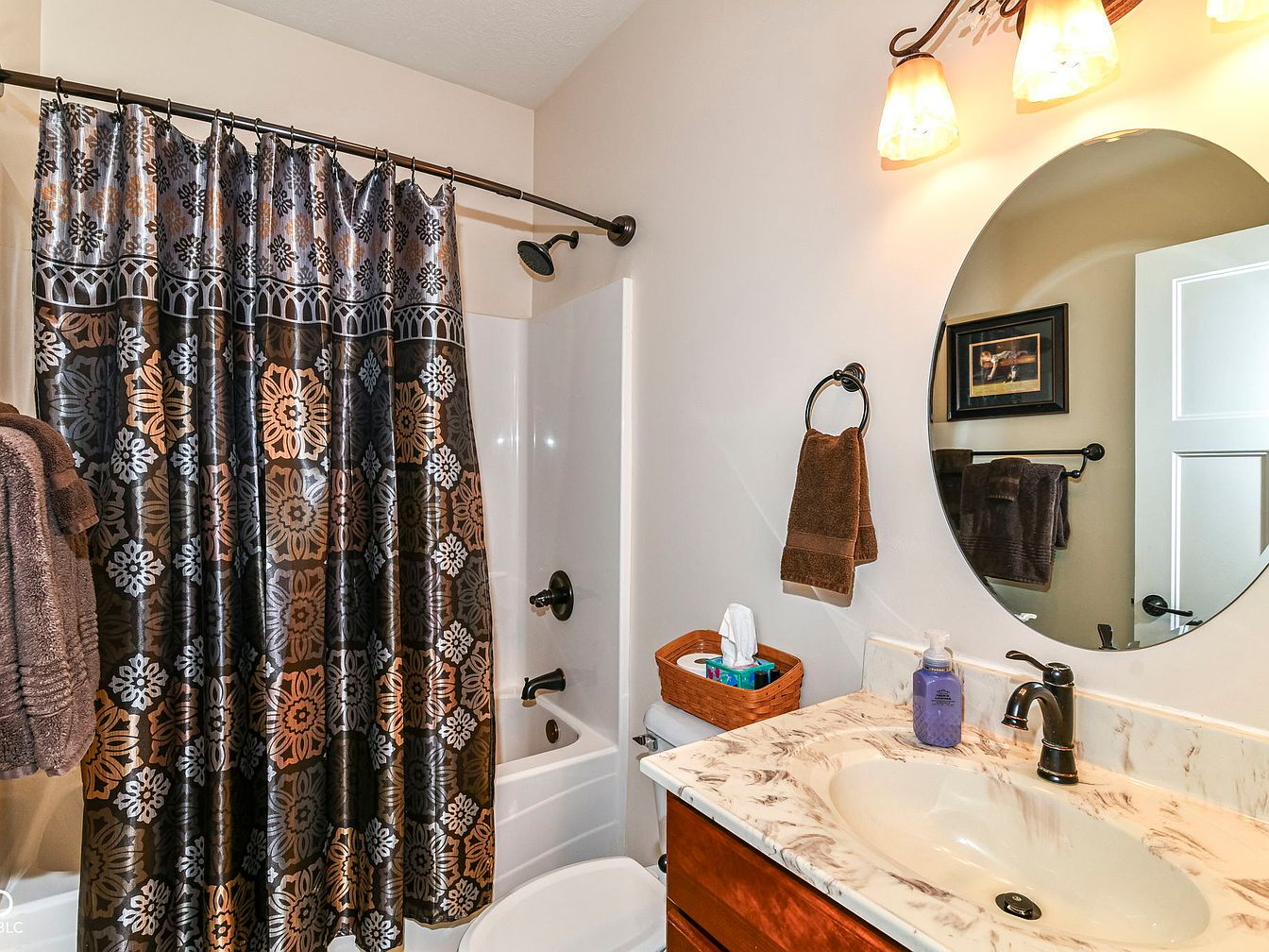 This bathroom features a compact layout with a combination bathtub and shower along one wall, enclosed by a decorative shower curtain in rich bronze, gold, and gray tones with a floral pattern. The walls are painted a neutral off-white, providing a clean backdrop. There is a vanity with a marbled countertop including an under-mount sink and oil-rubbed bronze faucet that complements the shower fixtures. Above the sink is a large oval mirror and two soft-glowing wall-mounted lights. Dark brown towels and a small wicker basket on the toilet add warmth and texture to the space.