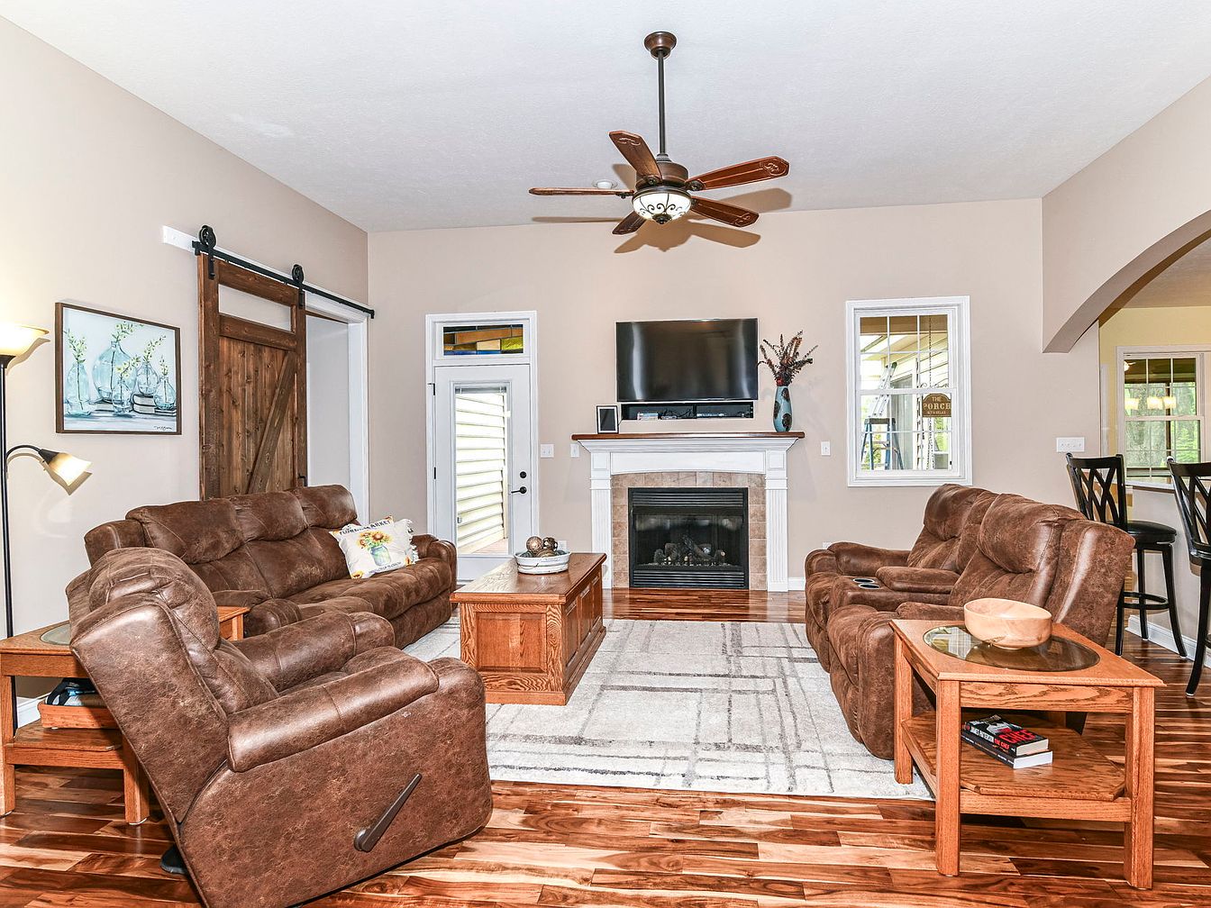 This inviting living space features a harmonious blend of warm brown tones and neutral shades. Plush, brown leather reclining sofas and chairs create a comfortable seating arrangement around a wooden coffee table set on a patterned area rug. A white fireplace with beige tile accents anchors the room, topped by a mounted flat-screen TV and a vase with floral decor adding sophistication. The space is well-lit naturally through glass windows and a door. Rustic elements include a sliding barn-style wooden door and rich hardwood floors, while a ceiling fan with wooden blades adds both function and charm.