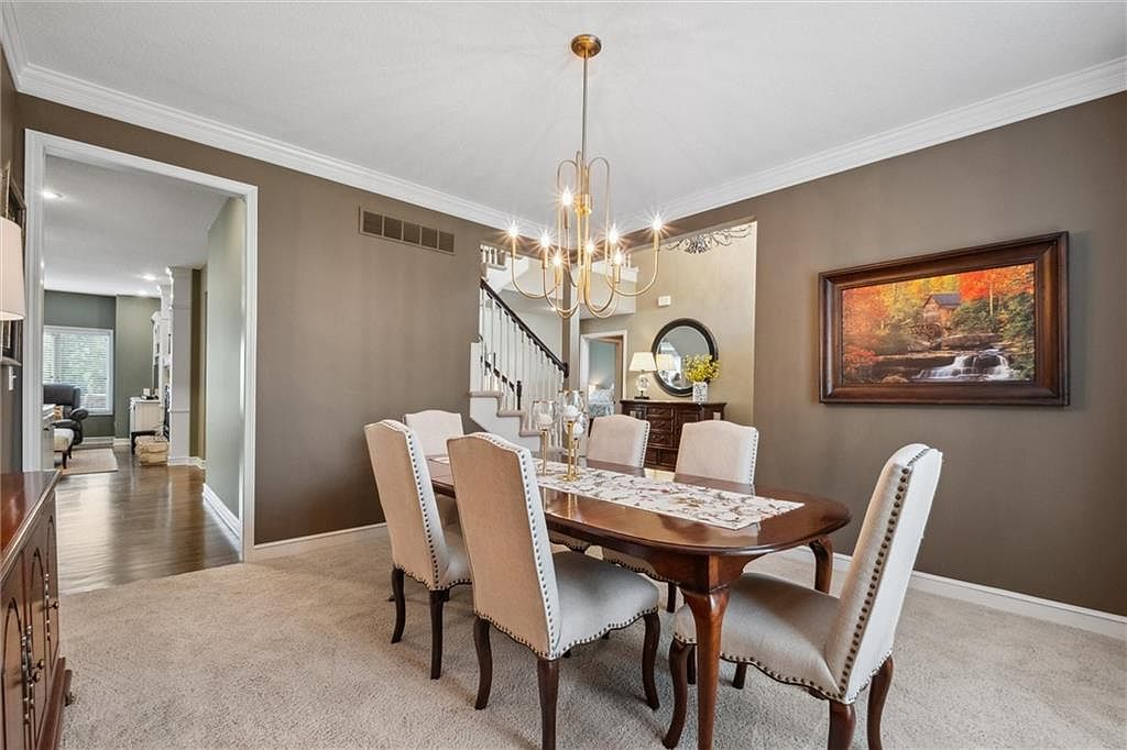 This elegant dining room features a warm, neutral palette with taupe walls complementing the light beige carpet. The centerpiece is a rich wooden dining table surrounded by six upholstered chairs with nailhead trim, blending classic and comfortable styles. A modern chandelier with brass accents hangs overhead, adding a touch of sophistication and ambient lighting. On one side, a framed painting of an autumnal landscape introduces seasonal color and charm. The space opens toward a corridor with hardwood floors leading to the living area, while a staircase with white balusters lends architectural interest and invites movement through the home.