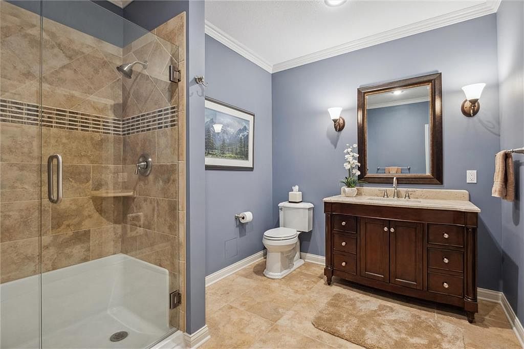 The bathroom combines calm and classic elements with a spacious layout. Light gray-blue walls provide a serene backdrop that contrasts elegantly with the warm, earth-toned tile flooring and shower tiling. The walk-in shower features large beige tiles accented with a horizontal mosaic stripe, enclosed by frameless clear glass, enhancing the sense of openness. A rich dark wood vanity with a cream-colored countertop anchors the room, complemented by a matching framed mirror and bronze sconces on either side, softly illuminating the space. Neutral-toned accessories and a soft bath mat contribute to the relaxing atmosphere, completing the refined look.