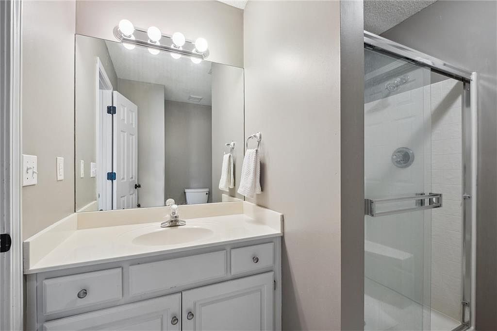 This bathroom features a compact yet functional layout, centered on a white vanity with a smooth countertop and an inset sink. The cabinetry below is painted white with simple round knobs, maintaining a clean, classic aesthetic. A large, frameless mirror spans the width of the vanity, reflecting ample light from the modern, multi-bulb fixture above, which lends a bright and inviting feel. Adjacent to the vanity is a glass-enclosed shower with sliding doors and contemporary silver hardware. The overall color scheme is neutral, with soft beige walls complementing the white fixtures, creating a fresh and minimalist space.